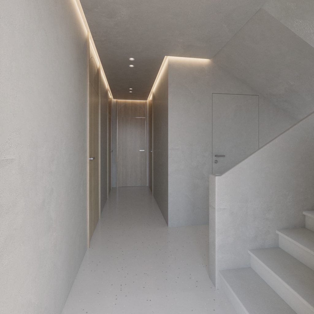 Hodnik in stopnišče sta zasnovana v minimalističnem in modernem slogu, kjer prevladujejo čiste linije in naravni materiali. Stene so obdelane v microtoppingu, kar prostoru daje eleganten in enoten videz. Vrata so iz svetlega lesa in imajo zaobljene zgornje robove, kar se ujema z zaobljenimi oblikami v celotnem interjerju. Osvetlitev hodnika je ambientalna, skrita svetila so nameščena vzdolž stropa in ob robovih stropne linije, kar ustvarja mehko in prijetno svetlobo. Dodane so tudi točkovne luči, ki poskrbijo za dodatno osvetlitev posameznih delov hodnika.