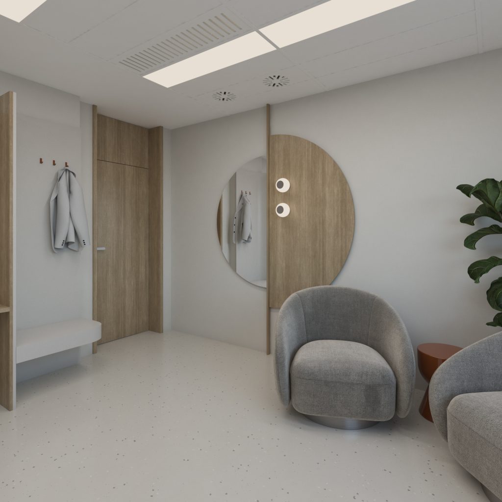 Prevladujejo mehke in zaobljene oblike, naravni materiali in topli odtenki rjavih in sivih barvnih tonov. Vsi uporabljeni materiali ustrezajo zdravstvenim higienskim standardom in zahtevam, kar zagotavlja varno in prijetno okolje. Stene v čakalnici, stopnišču in hodnikih so obdelane v microtopping, kar prostoru daje edinstven značaj. Poseben poudarek smo dali elementom v imitaciji brušene kovine, kot so recepcijski pult, korito za rožo, obok in viseče omarice v ambulantah, ki dodajo eleganco in sodoben pridih. Barvne poudarke v prostor vnesejo čakalni stoli v živih barvnih odtenkih.