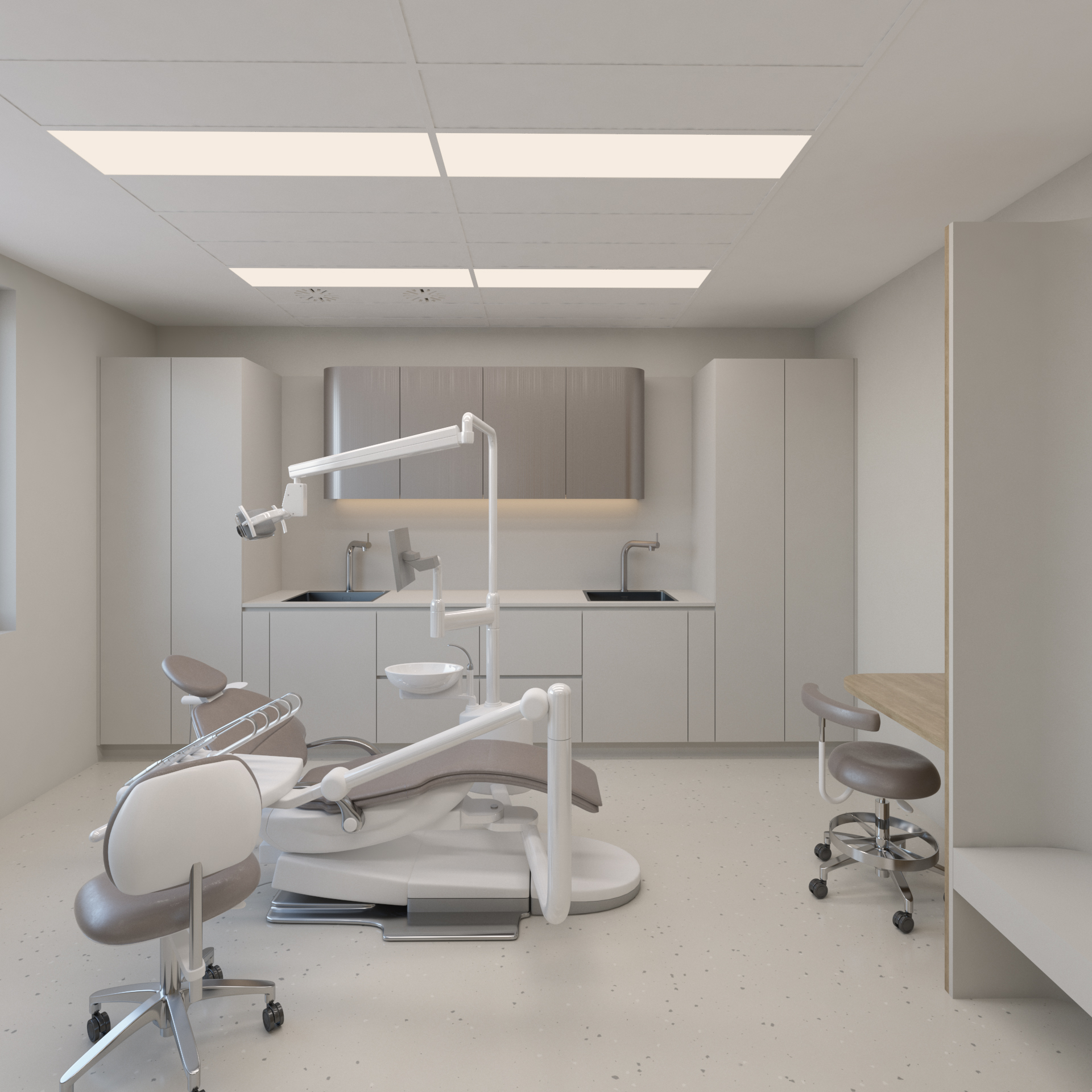Ambulante dentalnega centra združujejo funkcionalnost in estetiko, kar ustvarja prijetno in profesionalno okolje za paciente in zaposlene. Svetli odtenki sivih in rjavih tonov, skupaj s poudarki lesa prispevajo k občutku miru in udobja, kar je ključnega pomena za sproščeno izkušnjo pri obisku zobozdravnika.