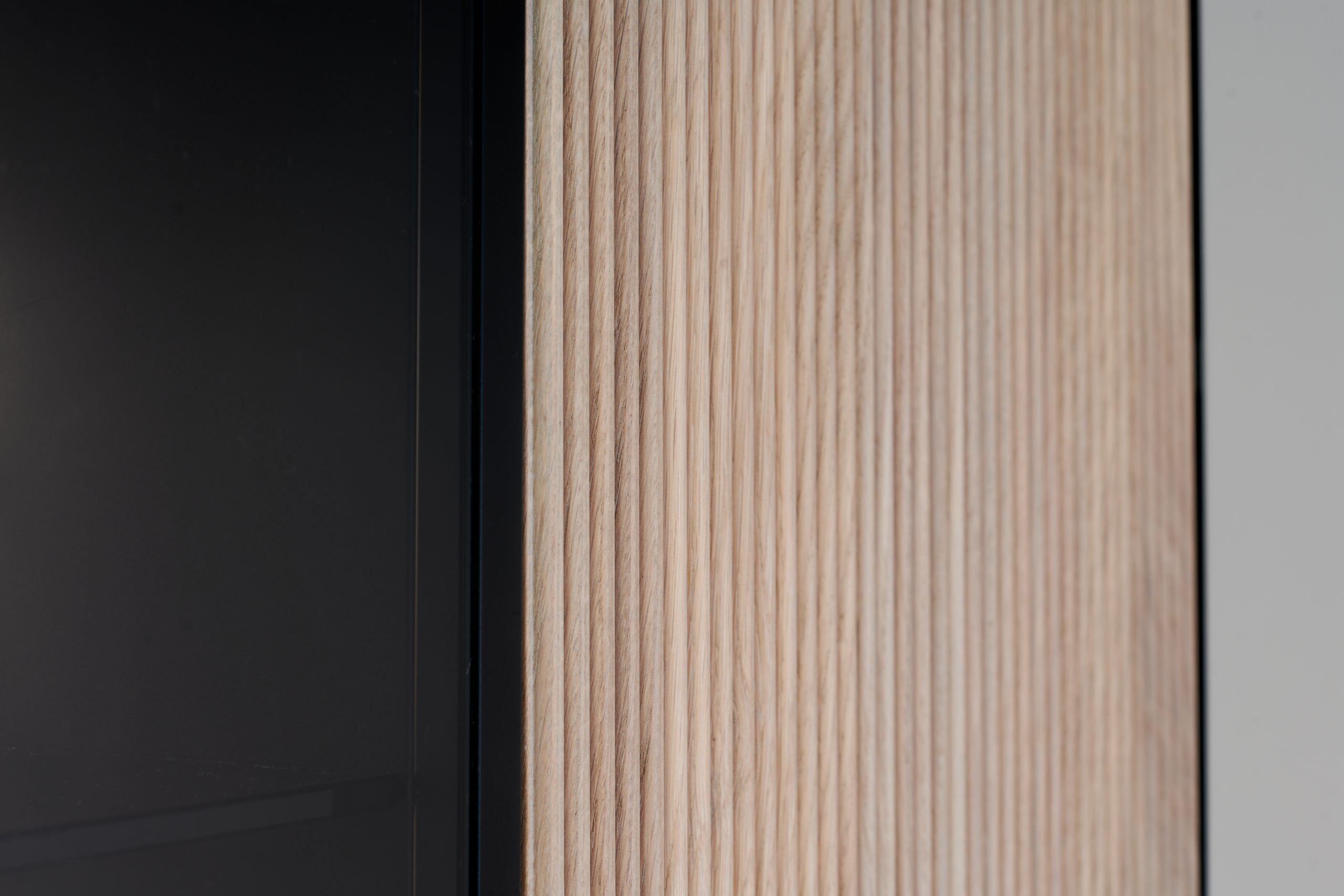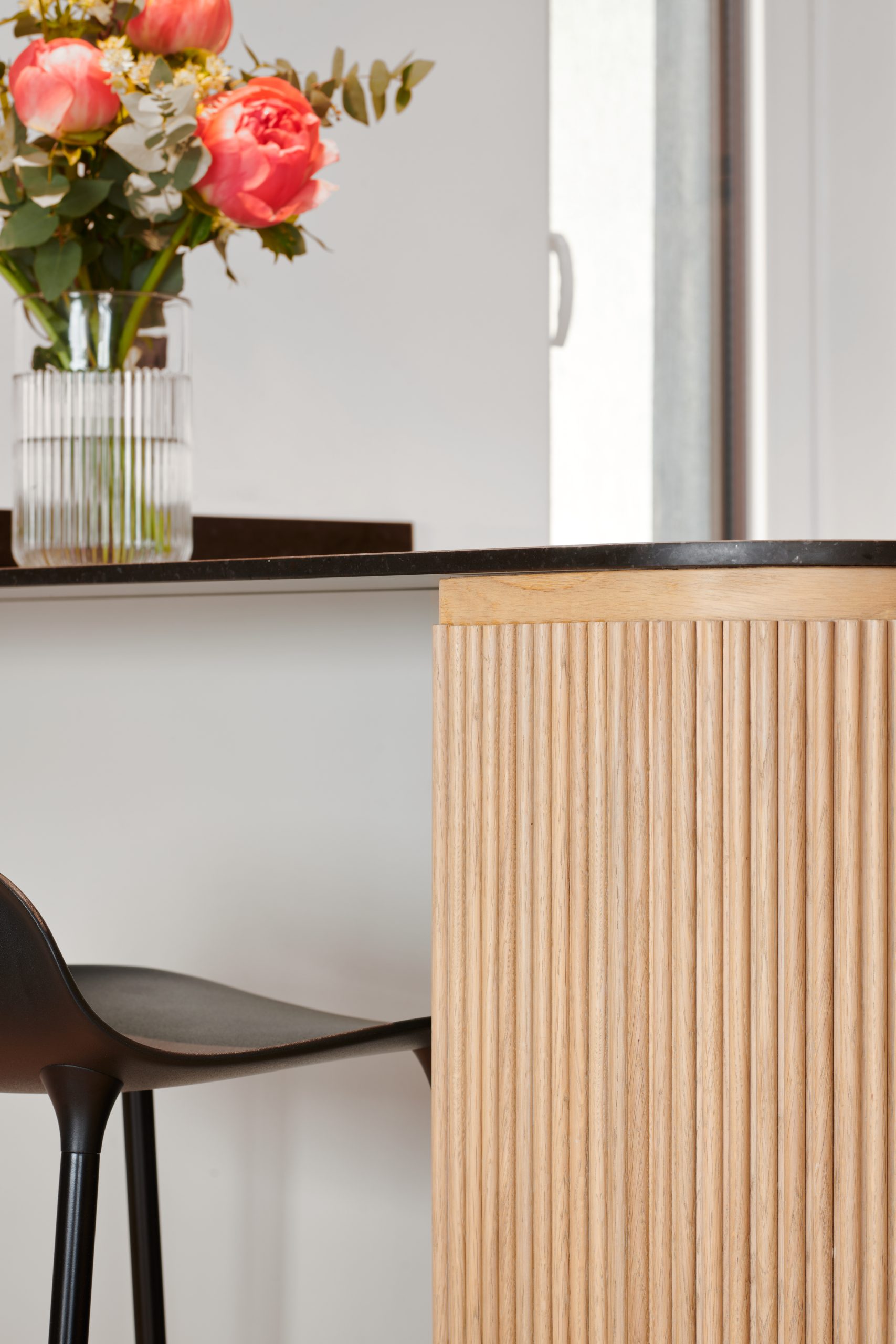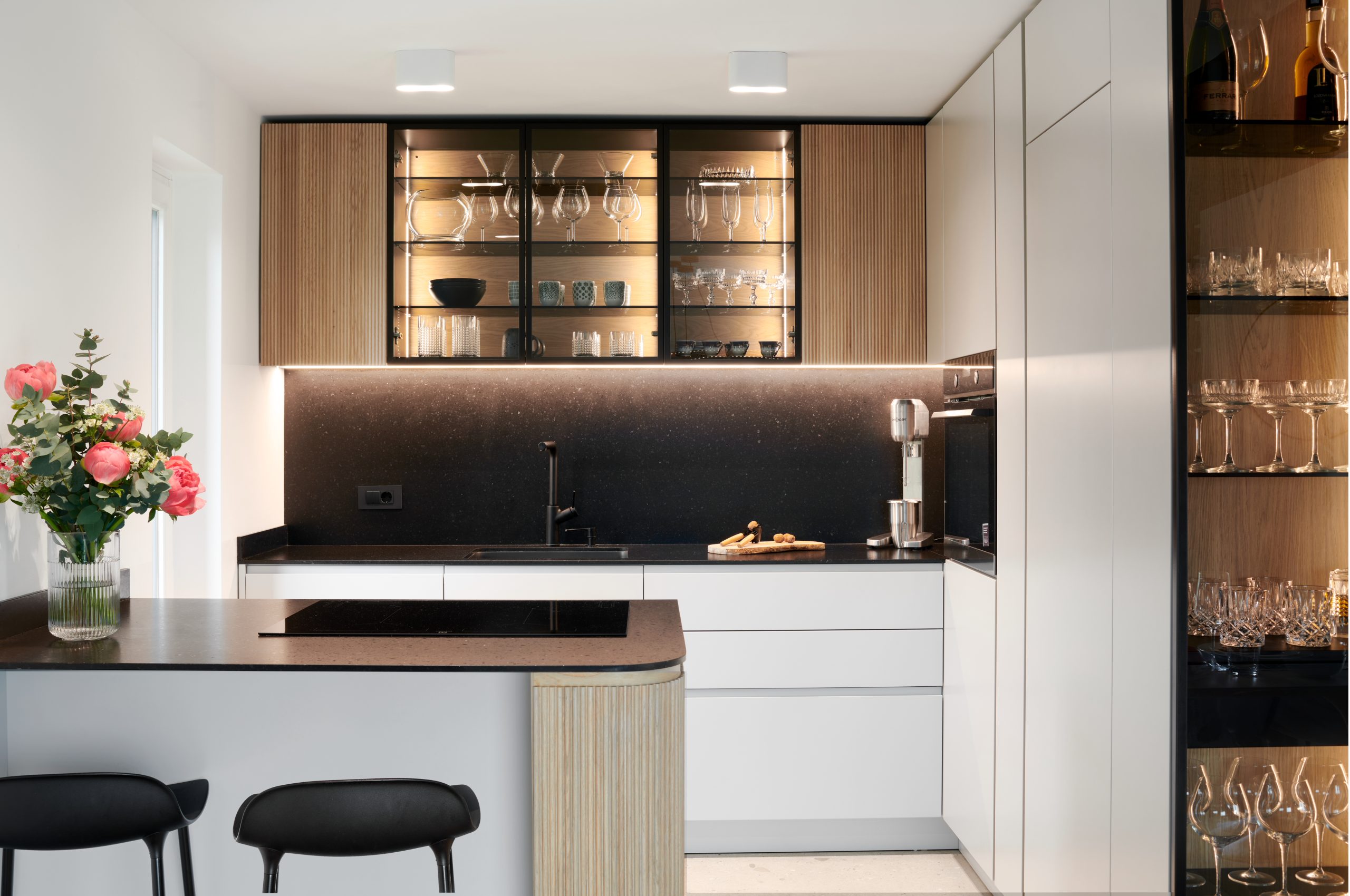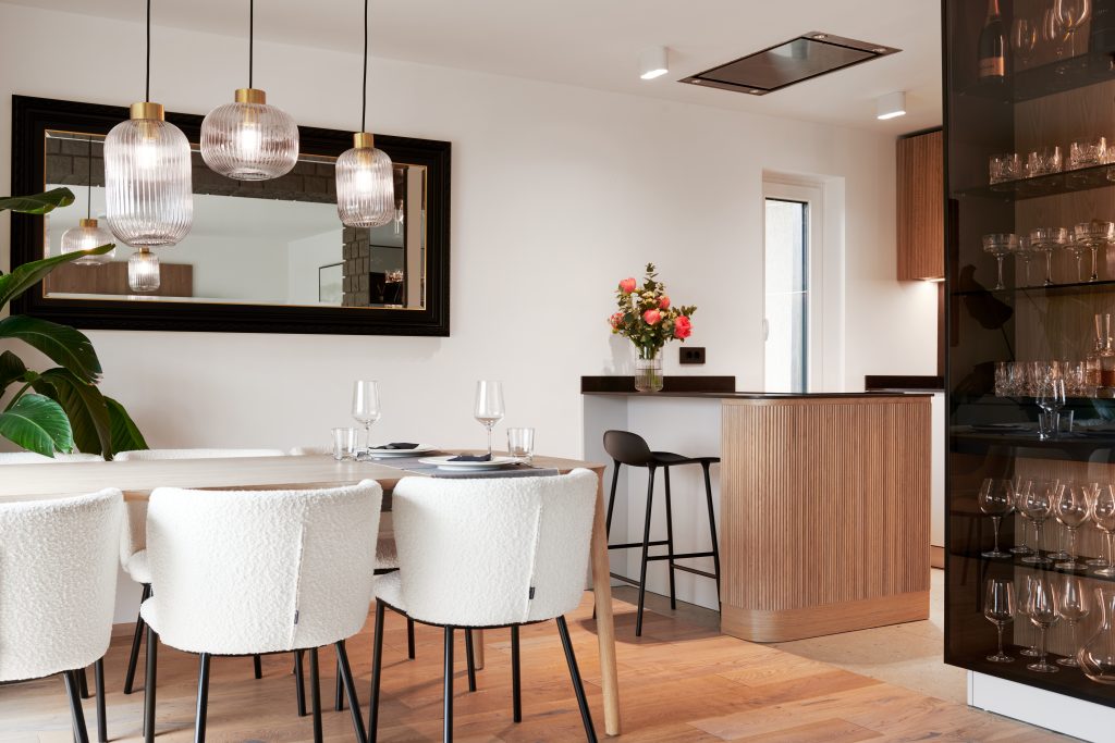 Kuhinja s pol barskim otokom in jedilnica predstavljata osrednji prostor za druženje s prijatelji in pripravo hrane. Kuhinjski pult in ozadje je izdelan iz tehničnega kamna v temni barvi, ki poudari lesene rezkane fronte omaric in svetlo kuhinjo. Na steno v jedilnici smo umestili ogledalo, ki sta ga naročnika želela ohraniti in s tem povečali občutek jedilnega kot. Topla ambientalna osvetlitev za ogledalom in v vitrini ob večernih druženjih pričara prijetno vzdušje.
