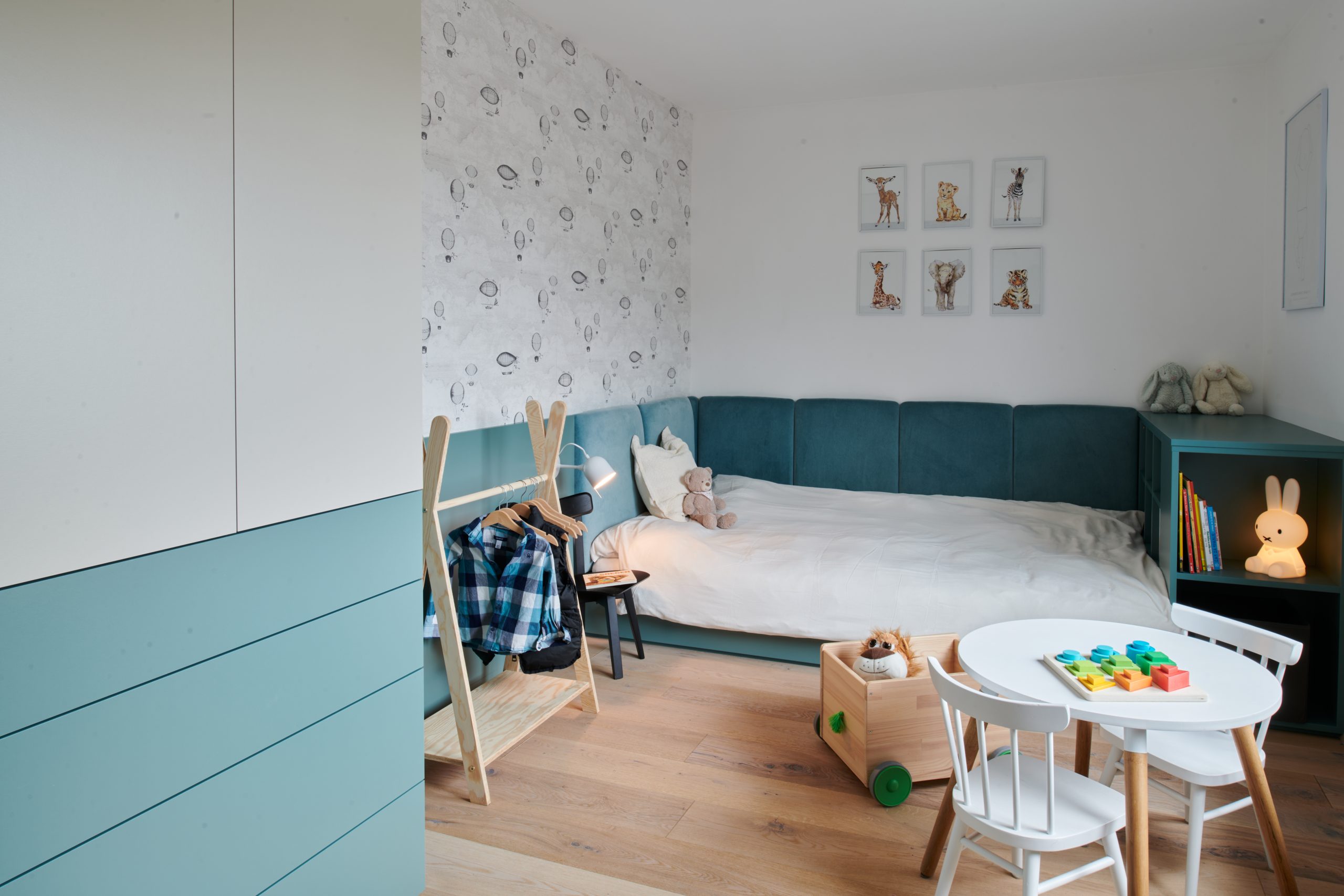 Ker naročnikov sinček obiskuje vzgojni zavod montessori, smo zanj tudi doma ustvarili varen, barvit in atraktiven interier, napolnjen z otrokom primernimi igračami, ustvarjalnimi materiali in učnimi pripomočki. Nizka postelja, odprte poličke, obešalo za oblačila in mizica za ustvarjanje mu omogočajo svobodo, da si sam izbere s čim se bo igral, ter sam vzame in pospravi oblačila. Igriva tapeta, z motivi balonov pa sobico še bolj poživi.
