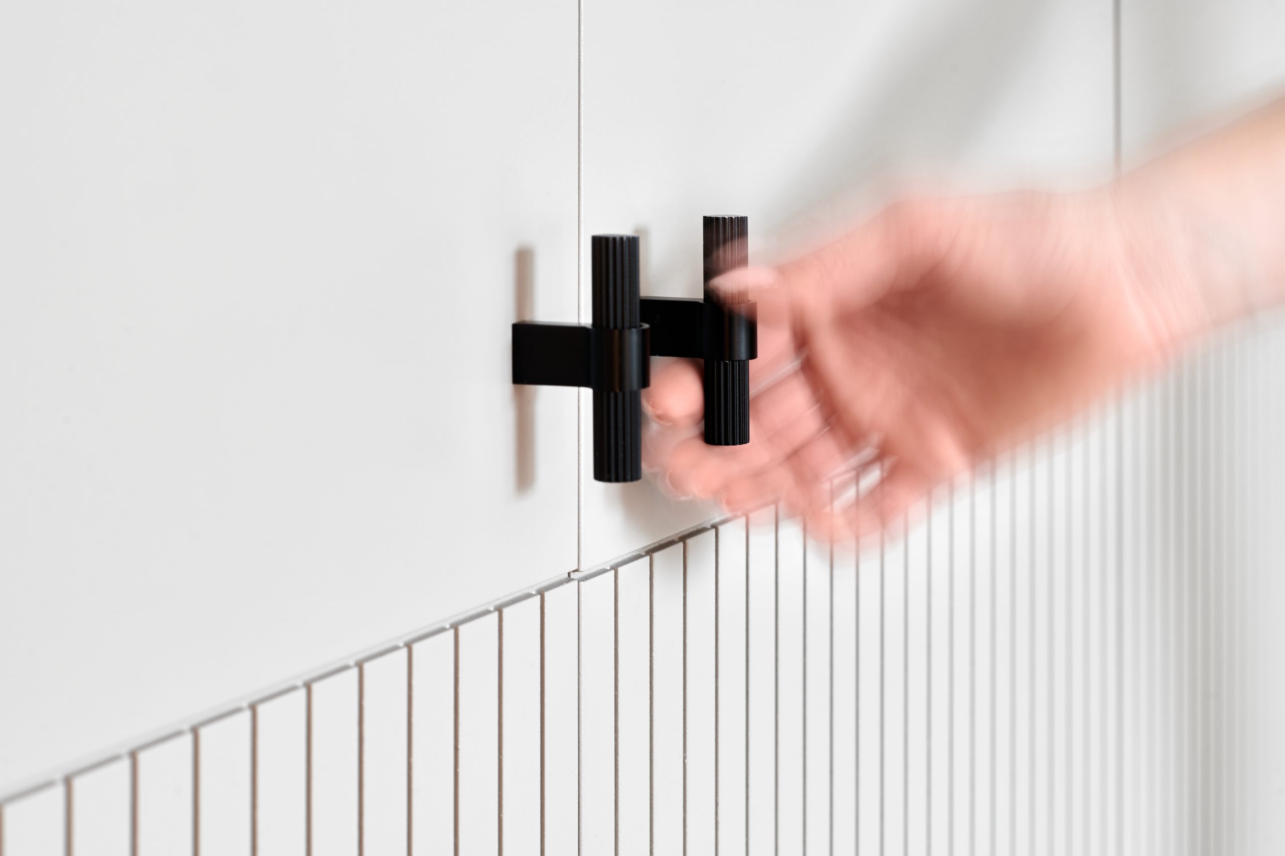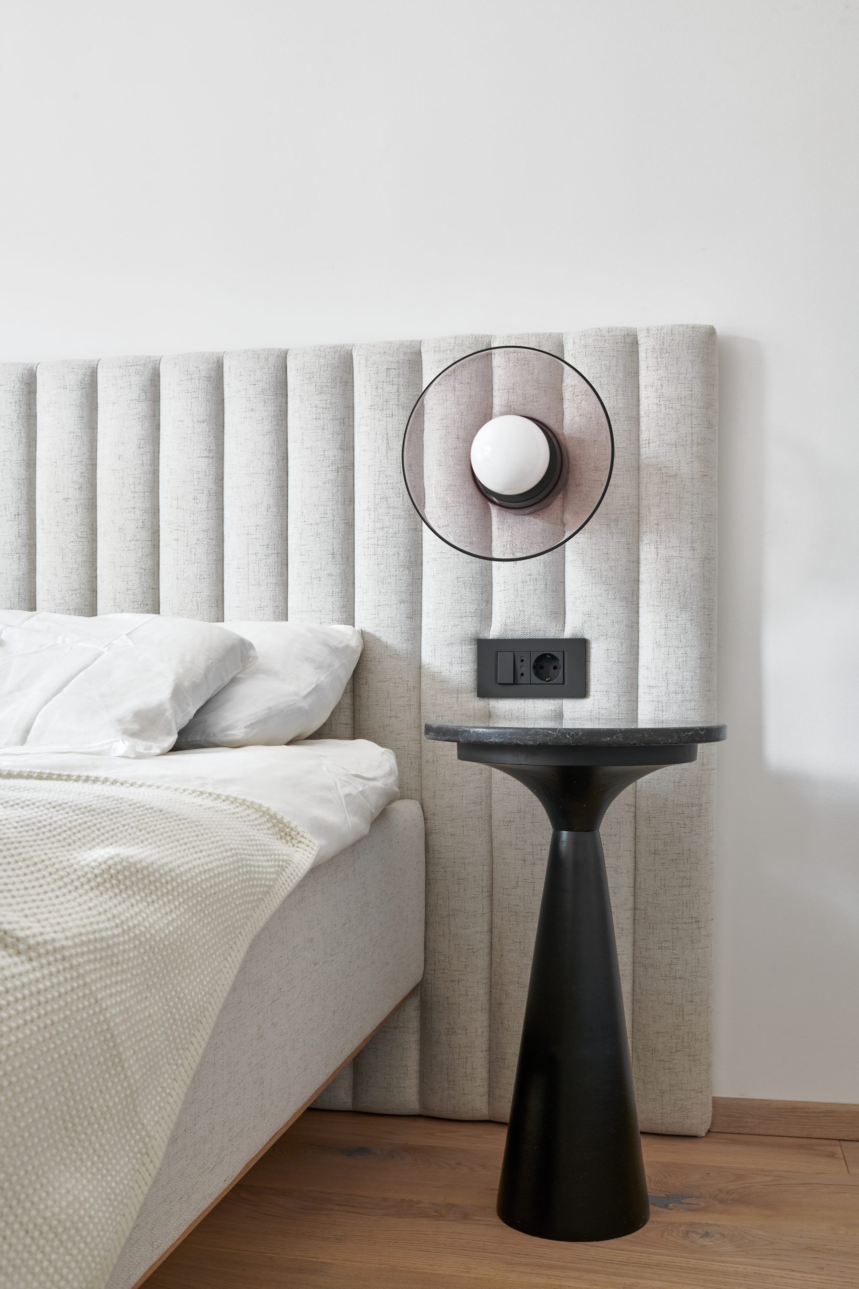 Spalnica je zasnovana v nežnih, svetlih odtenkih. Tudi tu se ponovi igra tekstur, ki se pojavi na rezkanih frontah omar. V mehko, rebrasto oblazinjeno vzglavje postelje sta vgrajeni stenski svetilki, ki interier naredita še bolj atraktiven.