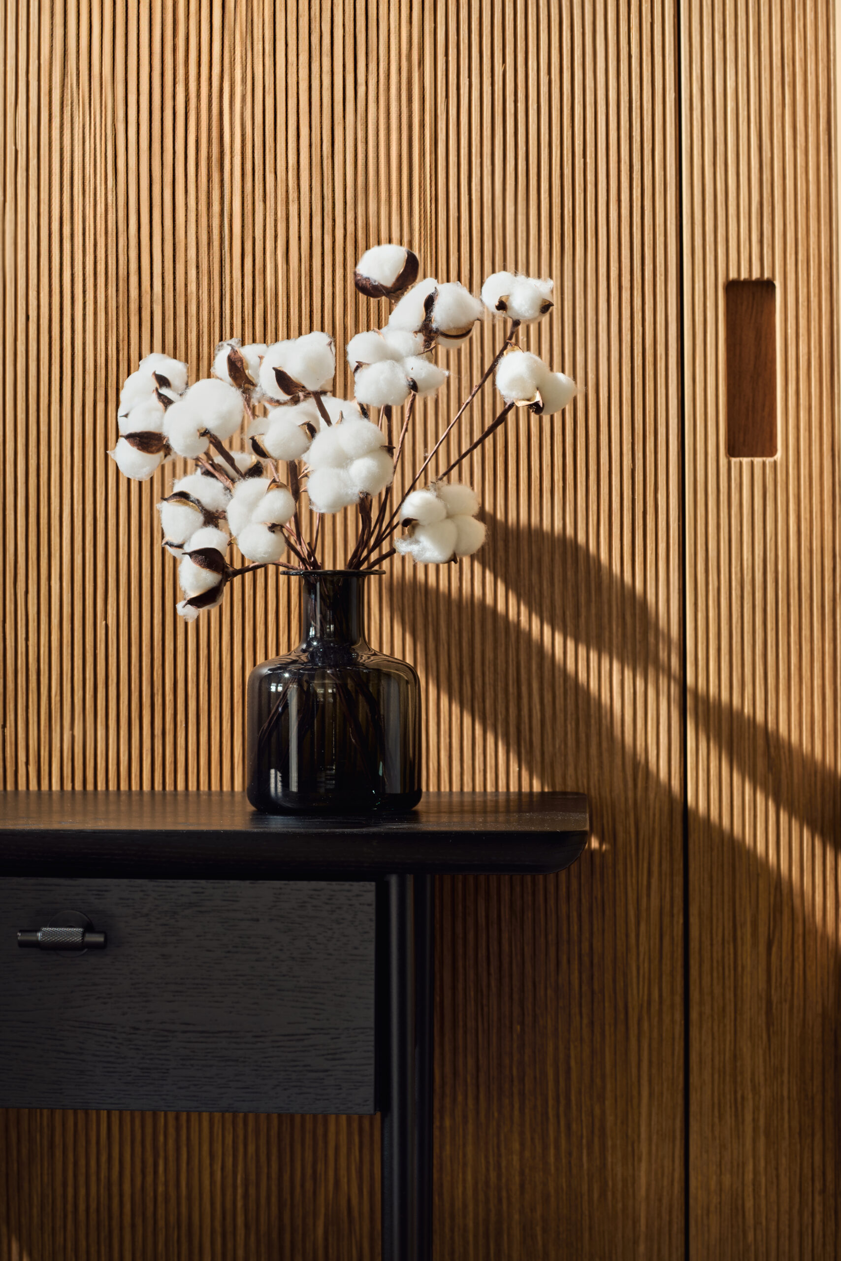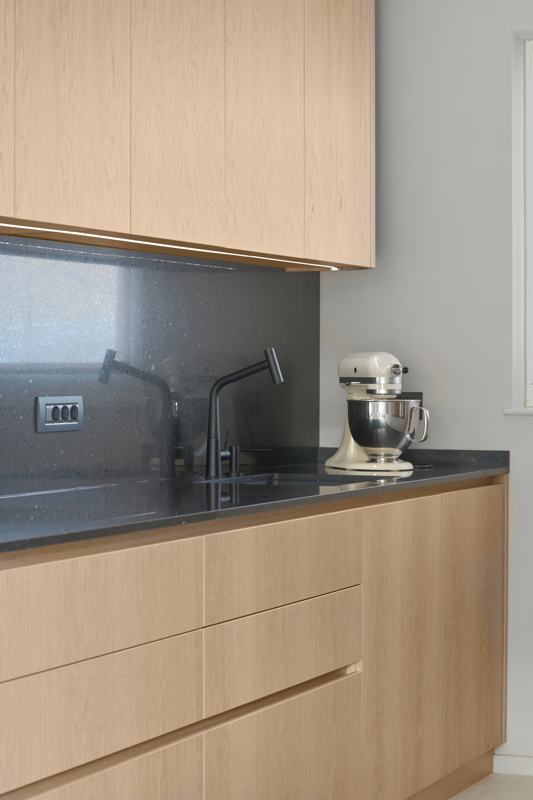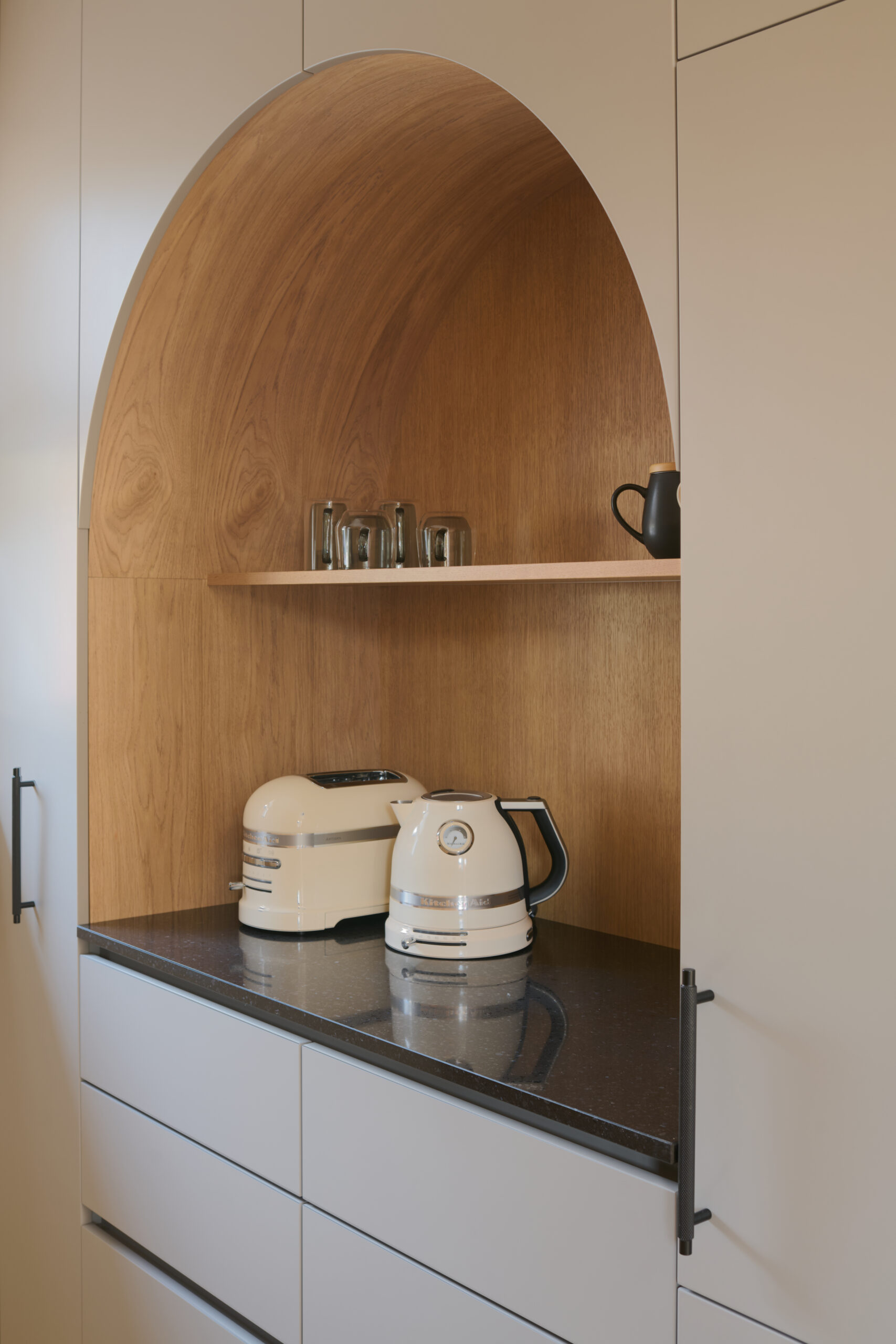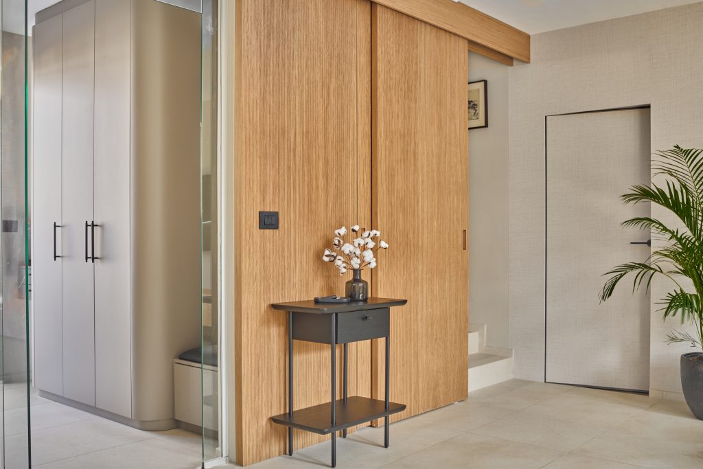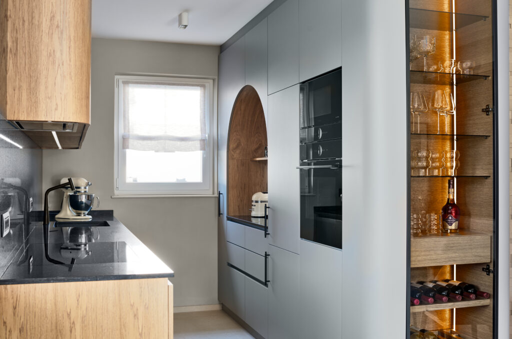Velik poudarek pri oblikovanju interierja smo namenili tudi detajlom. Eden izmed teh je fino porezkana lesena stenska obloga v dnevno bivalnem delu, ki dodaja prostoru toplino, teksturo in karakter. Poleg tega smo posvetili pozornost detajlom tudi v kuhinji. Polkrožna niša, ki je zasnovana kot shramba za male gospodinjske aparate je premišljena rešitev, ki omogoča, da so aparati enostavno dostopni in hkrati diskretno shranjeni. Poleg tega polkrožna oblika niše dodaja dinamičen element v prostor in mu daje zanimiv vizualni poudarek.