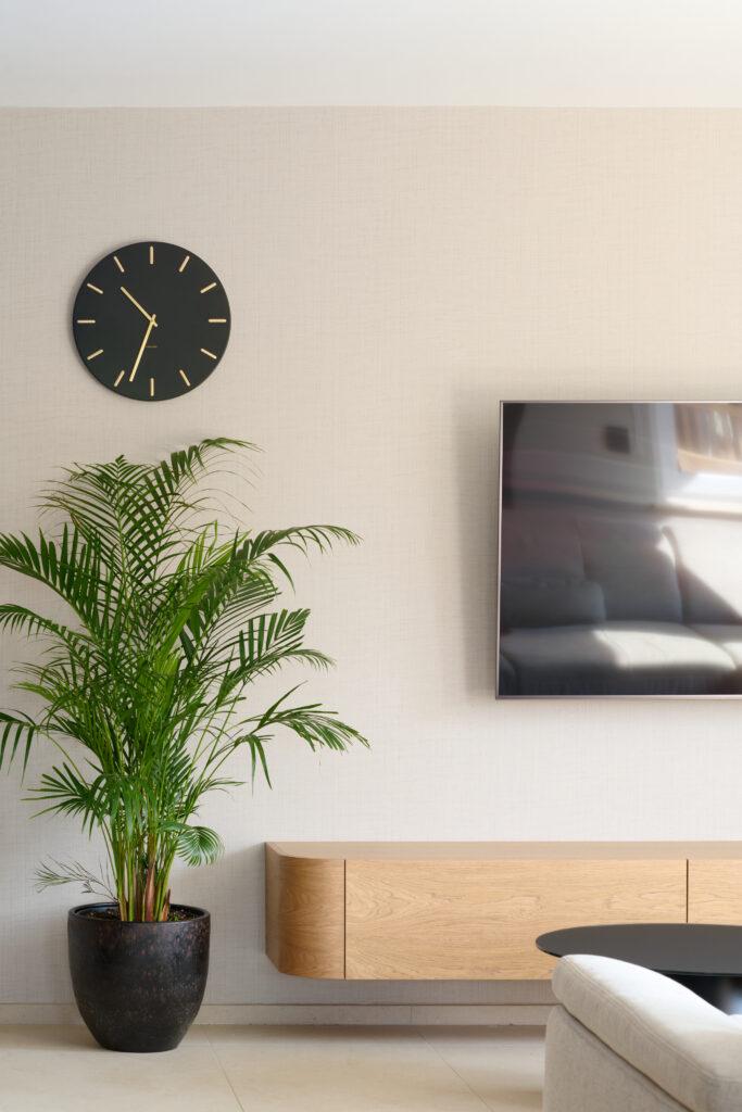Posebnost dnevne sobe je nežna in minimalistična lanena tapeta znamke London Art, ki se razprostira skozi celotno steno in ustvarja elegantno in pomirjujoče ozadje za prostor. Lesena TV omarica ustvari ravnovesje med toplino naravnih materialov in minimalistično eleganco, kar ustvarja prijetno in vabljivo okolje za sprostitev in druženje. Dnevna soba se nadaljuje v jedilnico ter nato v kuhinjo, ustvarjajoč tekoč in povezan prostor za bivanje in druženje. Od udobnega prostora za sprostitev v dnevni sobi do tople in vabljive atmosfere v jedilnici ter praktične elegance v kuhinji, vsak del prostora odraža svojo funkcijo, hkrati pa se dopolnjuje z ostalimi deli doma.