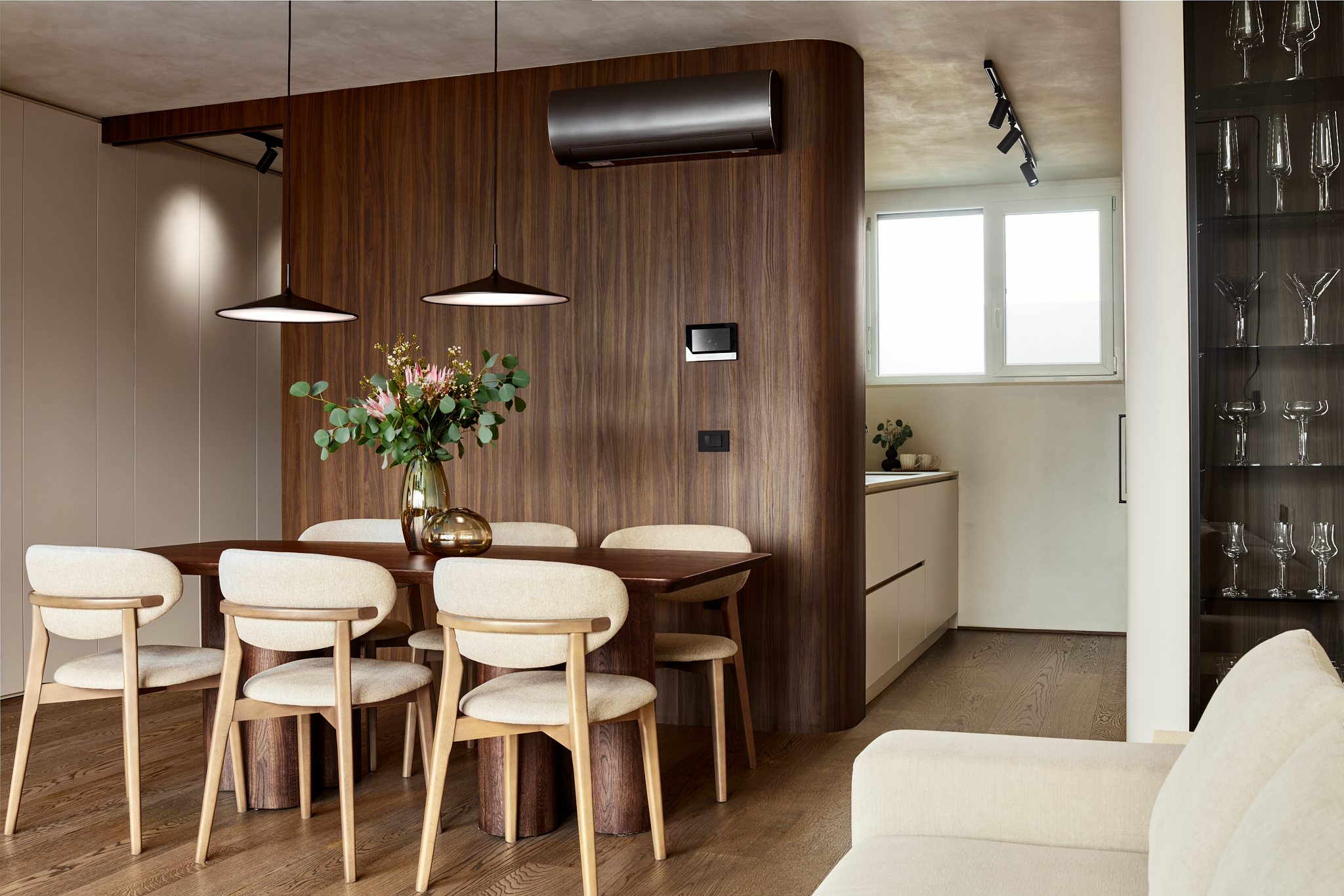 Iz vhoda, skozi drsna vrata, skrita v leseni stenski oblogi vstopimo v čudovito jedilnico, ki prehaja v dnevno sobo. Lesena stenska obloga ustvarja občutek topline in domačnosti, medtem ko dekorativni beton na stropu in stenah doda sodoben pridih. V ospredju je jedilna miza iz temnega lesa, obdana z oblazinjenimi stoli v svetli bež barvi. Nad mizo visita minimalistični črni svetilki, ki poudarjata modernost prostora. Desno od jedilnice je prehod v kuhinjo, ki je zasnovana v nevtralnih tonih in deluje kot naravno nadaljevanje prostora. Kuhinja se z vitrino za kozarce lepo poveže s preostalim prostorom, ustvarjajoč prijeten in usklajen ambient.