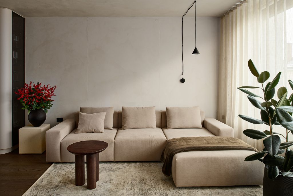 Osrednji element umirjene in sodobno zasnovane dnevne sobe v nežnih naravnih tonih je modularna sedežna garnitura v bež barvi, ki omogoča udobno sedenje in sproščanje. Naravna svetloba prehaja skozi velika okna, prekrita s prosojnimi, bež zavesami, ki mehčajo svetlobo in ustvarjajo prijetno vzdušje. Prostor zaokrožuje nežna tekstura preproge v nevtralnih tonih, ki še dodatno poudari toplino in udobje prostora.
