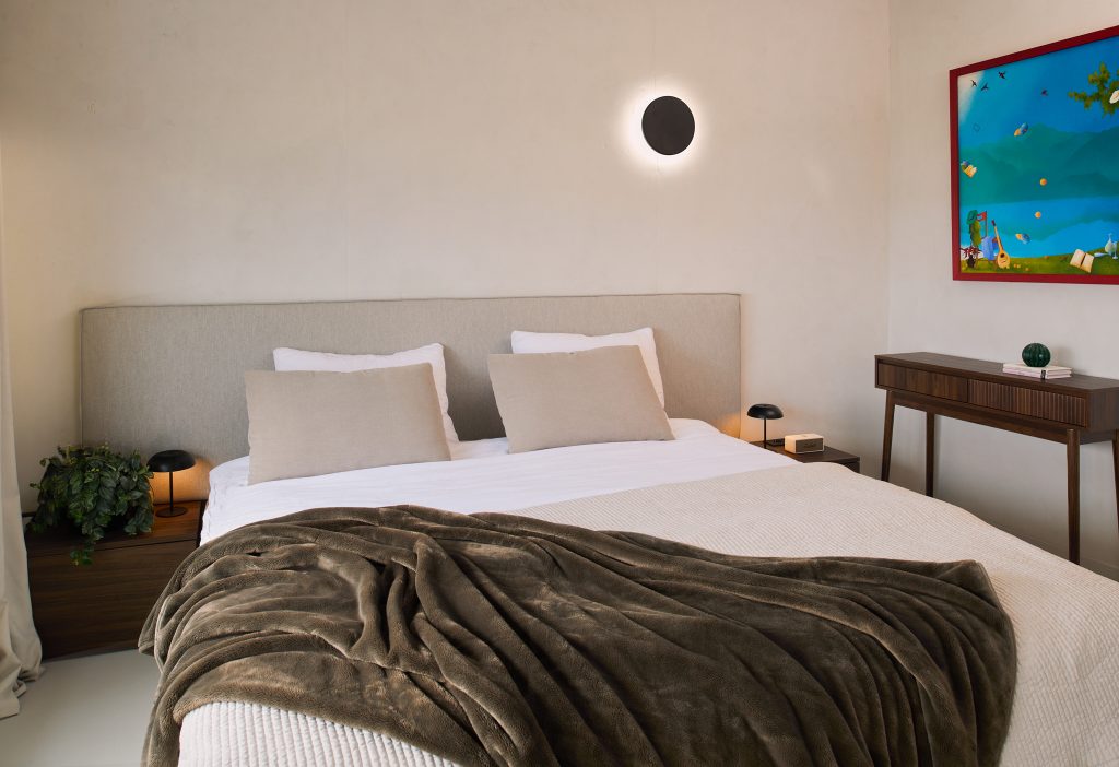 Spalnica izžareva umirjenost in eleganco z nevtralno barvno paleto in premišljeno izbiro materialov. Osrednji element je udobna postelja z oblazinjenim vzglavjem v svetlih tonih, ki prostoru dodaja mehkobo in toplino. Ob postelji stojita minimalistični nočni omarici, na katerih se nahajajo sodobne nočne luči.