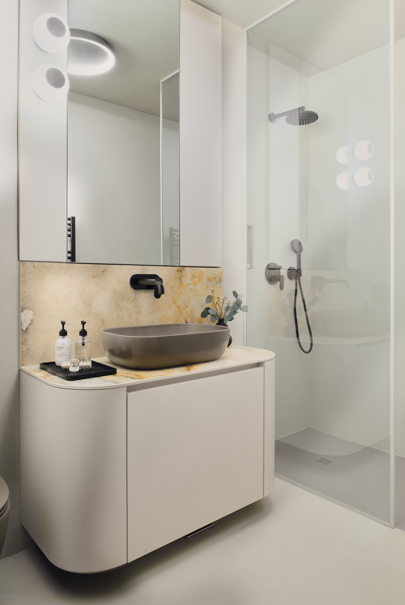 Kopalnica je zasnovana v sodobnem in funkcionalnem slogu. Tudi tukaj se nadaljuje glavna nit projekta- microtopping. Ta izbira materiala s svojim minimalističnim videzom ne le dopolnjuje celotno estetiko interierja, ampak zagotavlja tudi trpežnost in praktičnost.