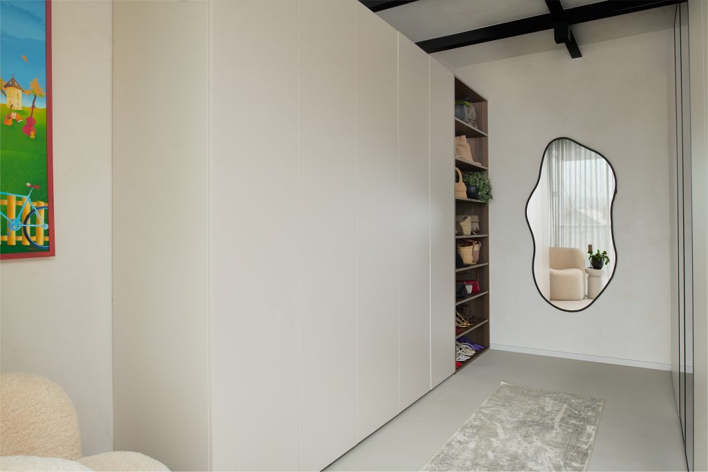 Garderobna soba je zasnovana kot prefinjen in funkcionalen prostor, kjer se eleganca prepleta s praktičnostjo. V ospredju so vgradne omare z brezčasnimi, čistimi linijami v nevtralnih tonih, ki zagotavljajo dovolj prostora za shranjevanje oblačil, obutve in modnih dodatkov. Končna omara ima odprte police, kjer so izpostavljeni izbrani kosi, medtem ko zaprti elementi ohranjajo red in minimalistični videz prostora.