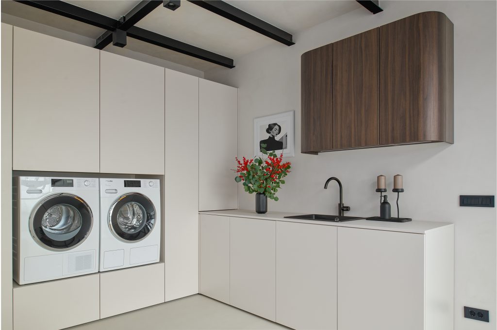 Utility prostor je zasnovan kot funkcionalna in organizirana enota, namenjena podpori vsakodnevnim opravilom. Prevladujejo čiste linije in nevtralni toni, ki ustvarjajo občutek urejenosti in prostornosti. Vgrajene omare in zaprti elementi zagotavljajo dovolj prostora za shranjevanje čistil, gospodinjskih pripomočkov in drugih potrebščin, s čimer je ohranjena minimalistična estetika prostora. Poseben poudarek je namenjen pralnemu in sušilnemu stroju, ki sta praktično umeščena drug ob drugem, kar omogoča optimalno izrabo prostora. Polkrožna, lesena viseča omarica pa prostoru doda pridih topline in naravne teksture. Utility prostor je s svojo premišljeno zasnovo nepogrešljiv del doma, ki združuje praktičnost in sodoben dizajn.