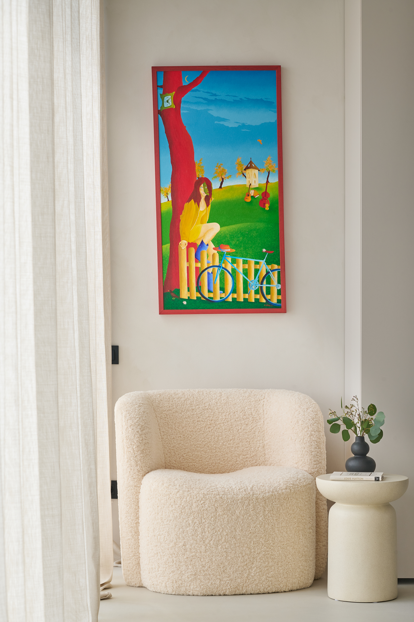 Poseben čar garderobni sobi dodaja lounge kotiček, ki v prostor vnaša pridih razkošja in udobja. V njem je postavljen manjši fotelj v svetlih tonih, ob katerem stoji preprosta stranska mizica. Celoten prostor poživi slika v živih barvah, ki služi kot barvni poudarek in vizualna osvežitev minimalistične zasnove.