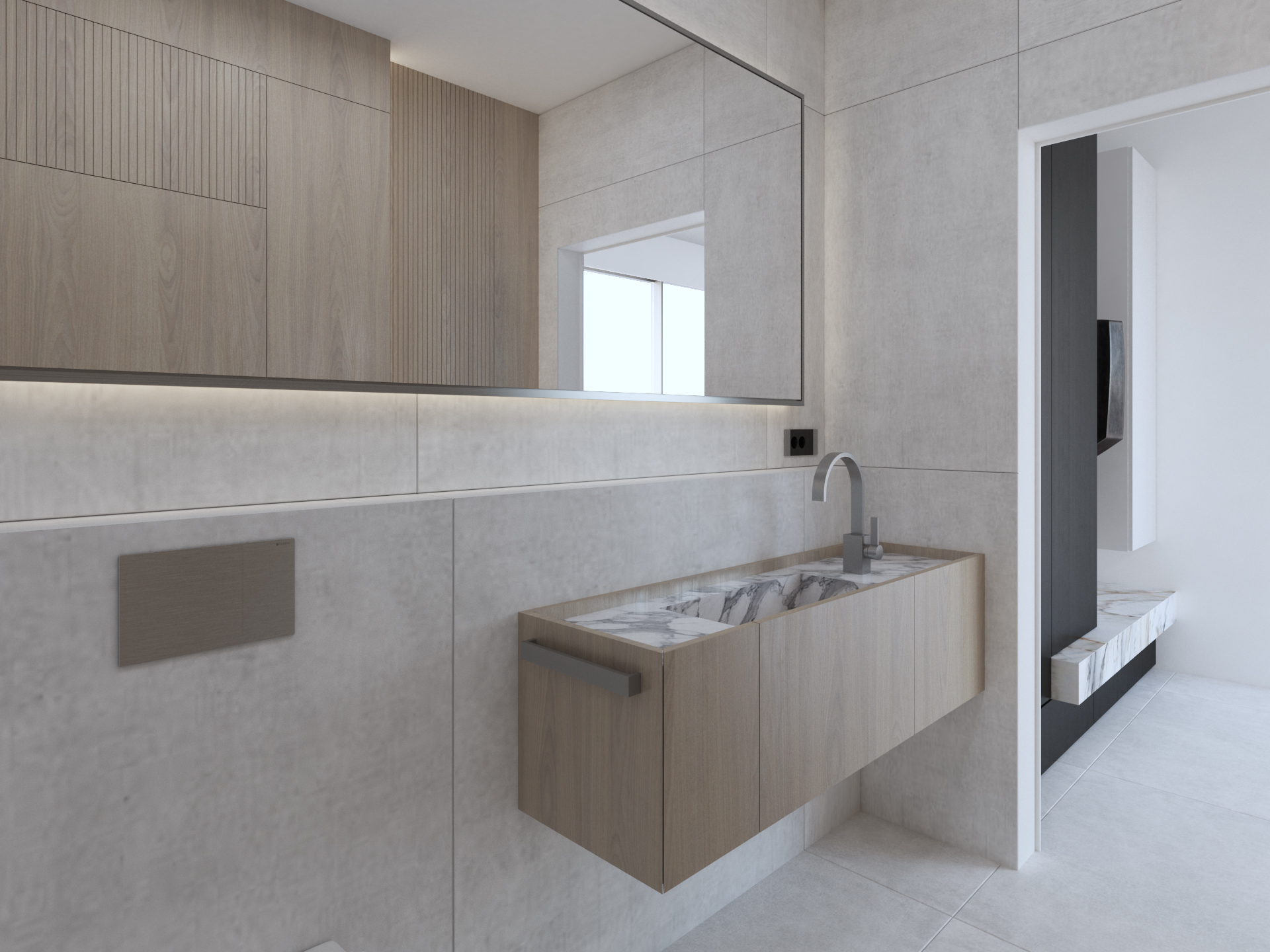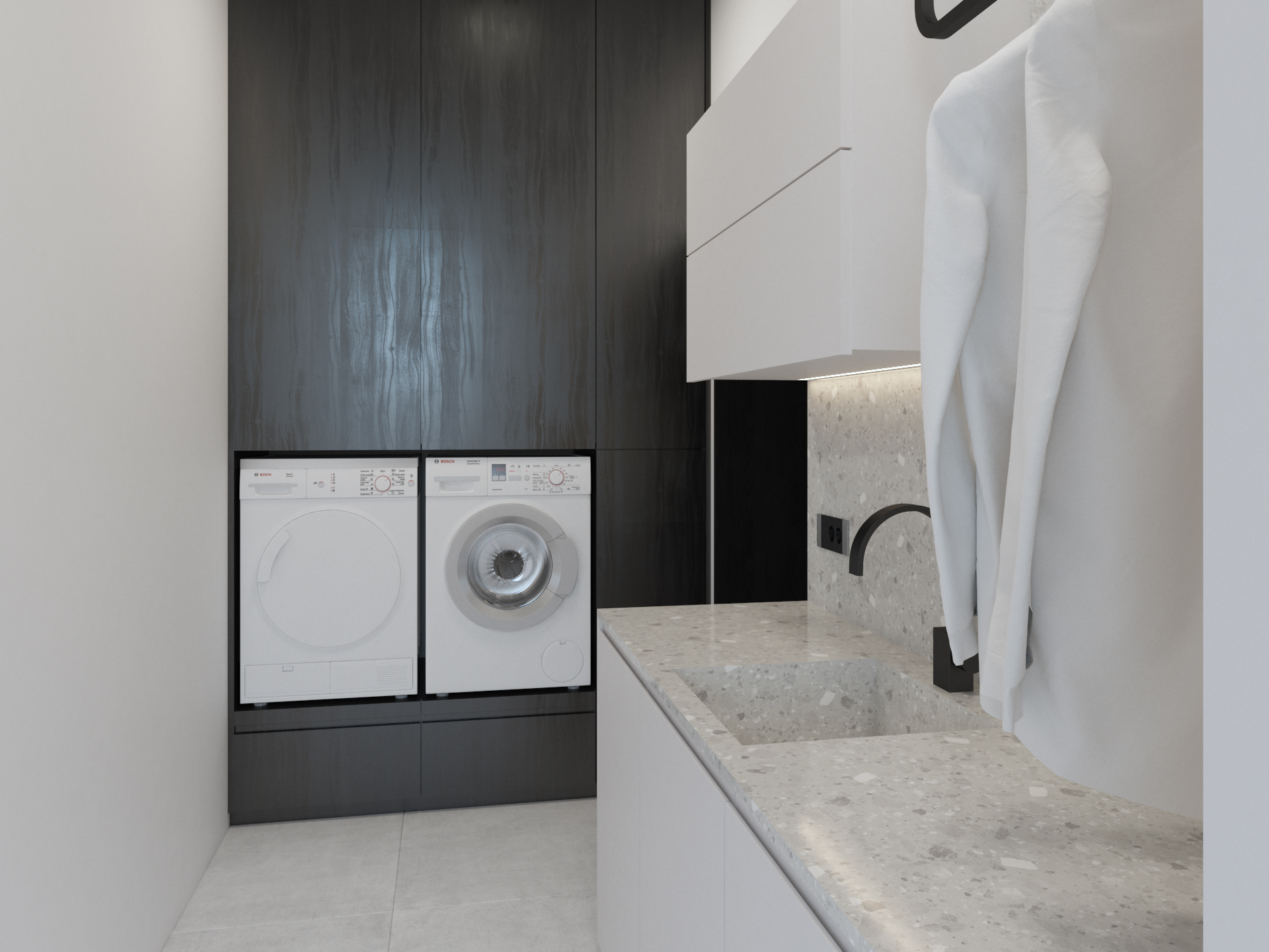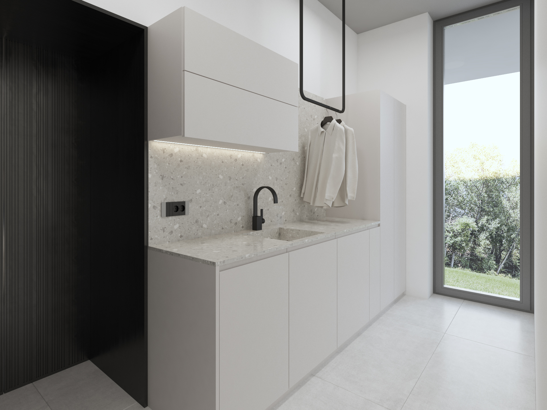 Izhodišče za izbor materialov je bila že obstoječa keramična talna obloga v srebrno sivi barvi. Da bi celotnemu interierju vnesli nekaj topline, smo za pohištvo po meri uporabili kar nekaj lesa, eleganco pa smo ohranili s tehničnim kamnom v odtenku Calacatta Luxe.