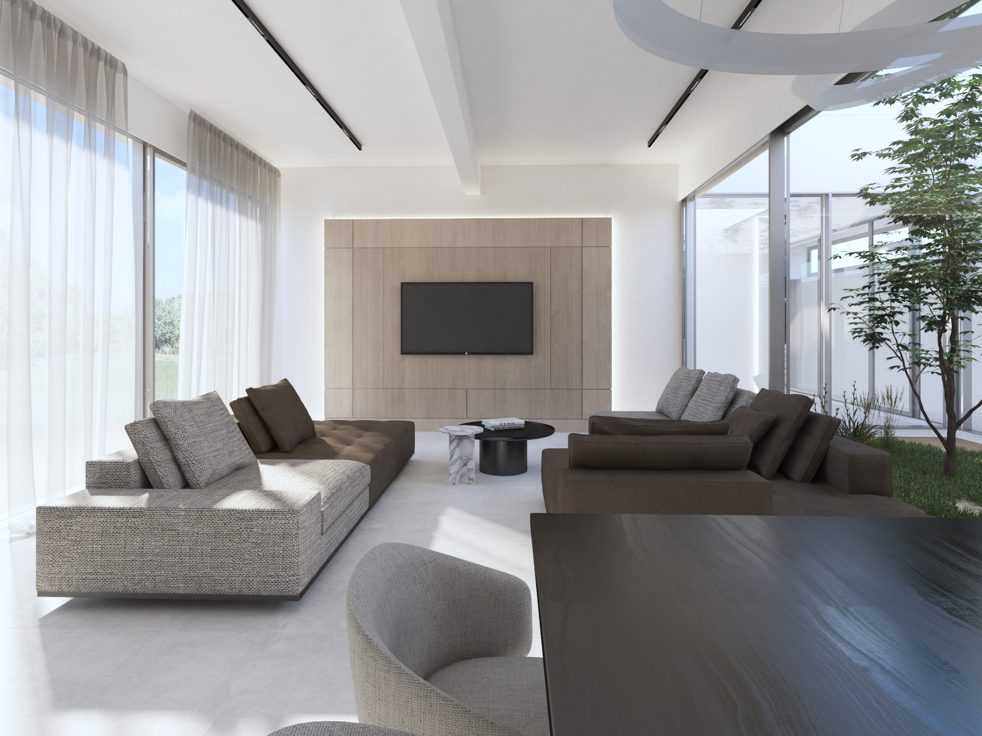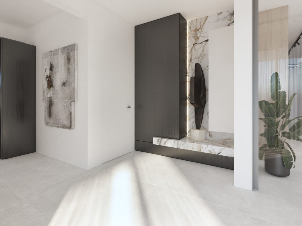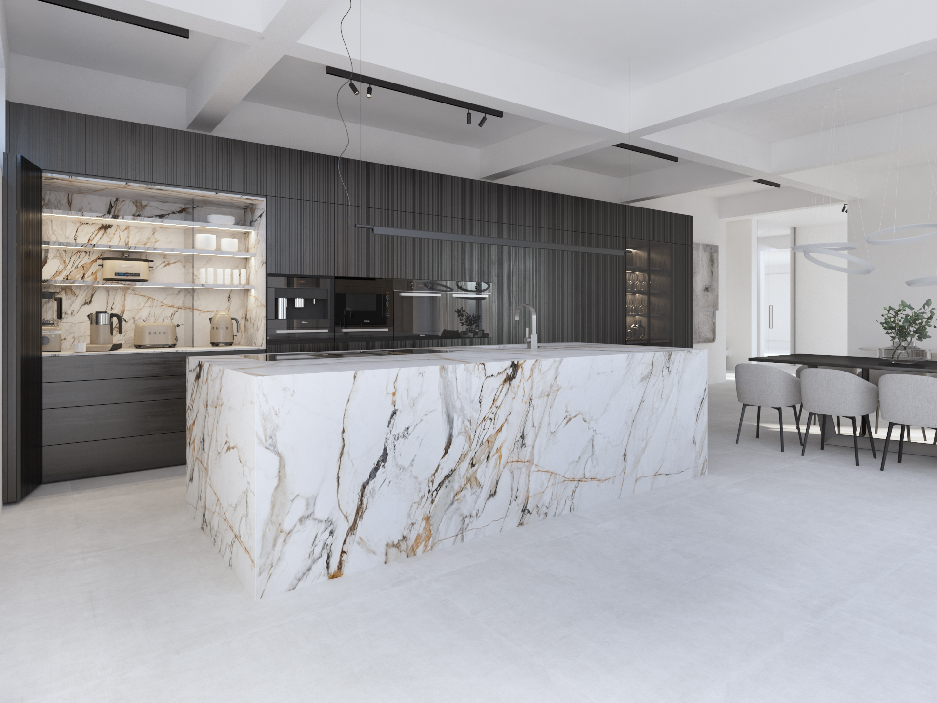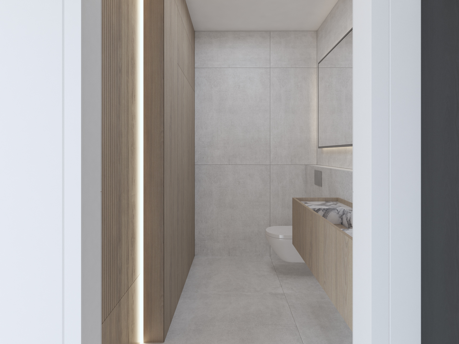 Izhodišče za izbor materialov je bila že obstoječa keramična talna obloga v srebrno sivi barvi. Da bi celotnemu interierju vnesli nekaj topline, smo za pohištvo po meri uporabili kar nekaj lesa, eleganco pa smo ohranili s tehničnim kamnom v odtenku Calacatta Luxe.