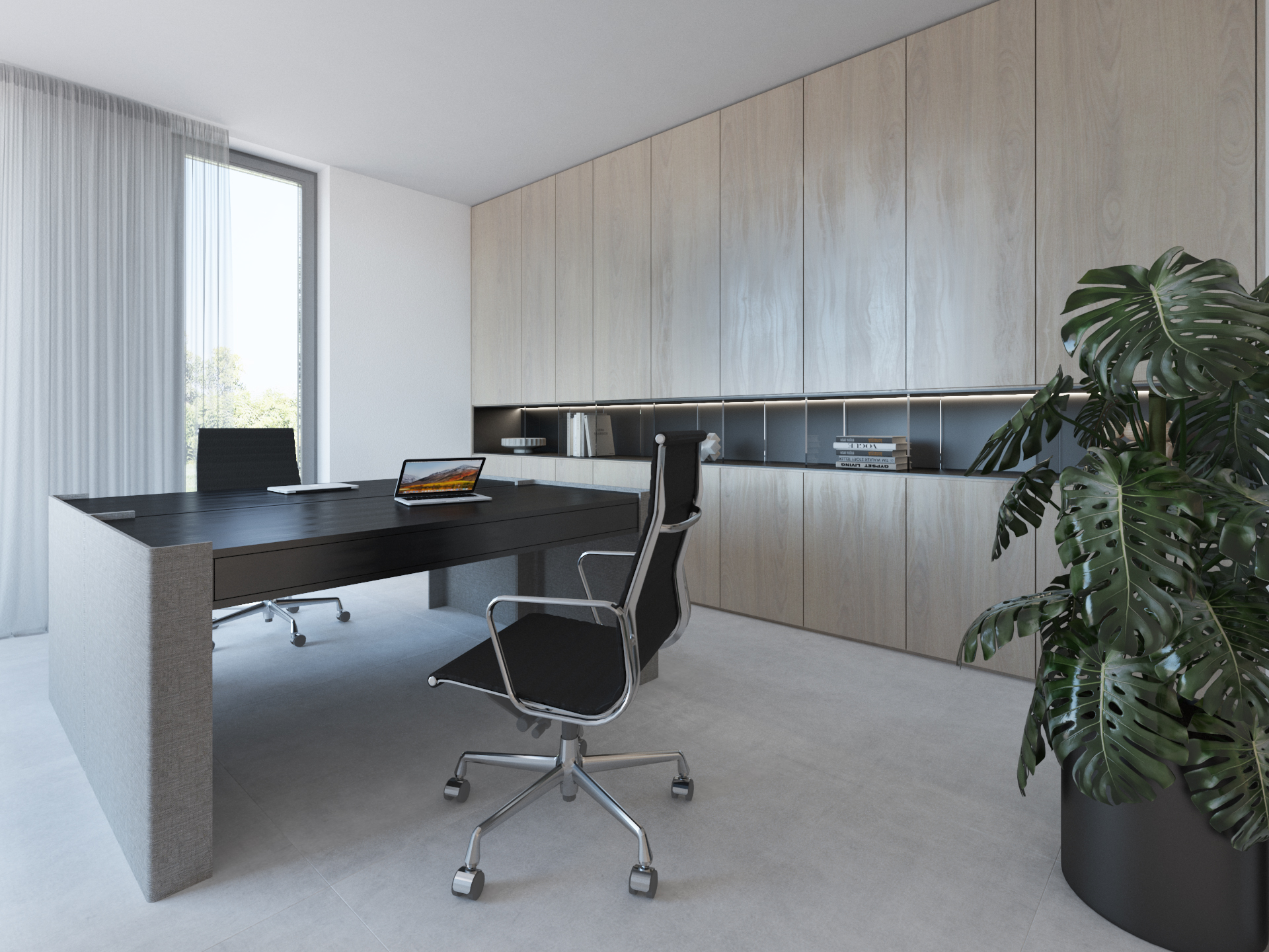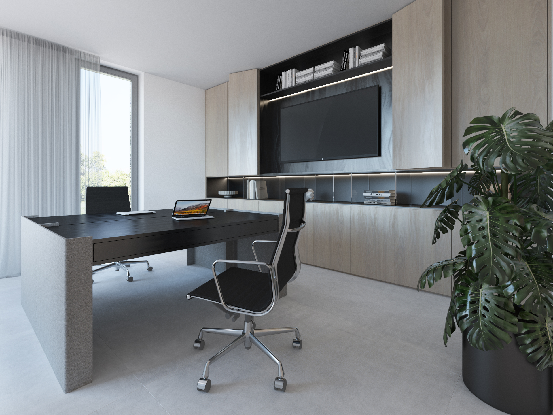 Pisarno krasi preprost dizajn in čiste linije. Naročnika sta si želela veliko shranjevalnih površin v sklop katerih pa smo skrili tudi televizijo in vse ostale pisarniške pripomočke. Materialom, ki smo jih uporabili že drugje po hiši smo dodali še tekstil na podnožju pisalnih miz.