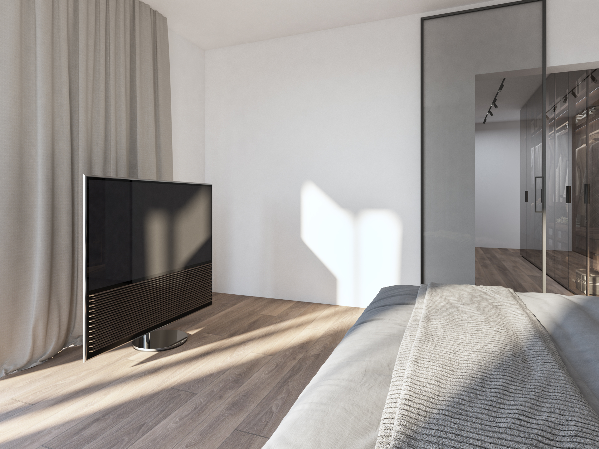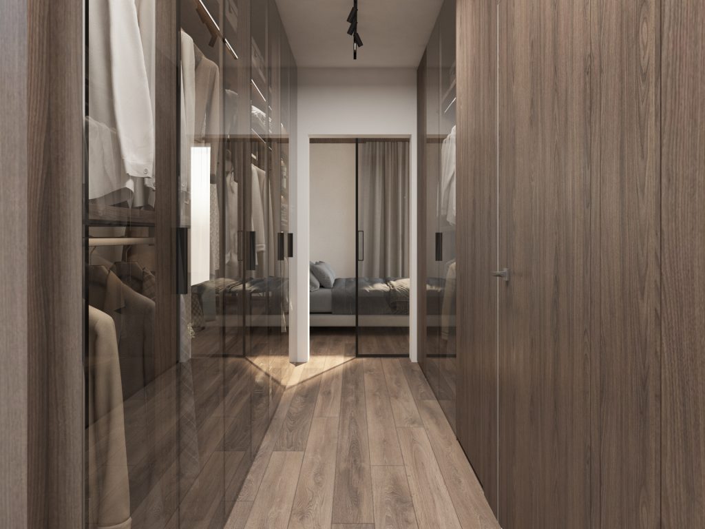 Prehod v spalnico in kopalnico je povezan z walk in omaro, kjer smo maksimalno izkoristili prostor za shranjevalne površine. Vse omare so zaprte, da pa bi optično povečali prostor, smo del omar naredili s steklenimi ličnicami.