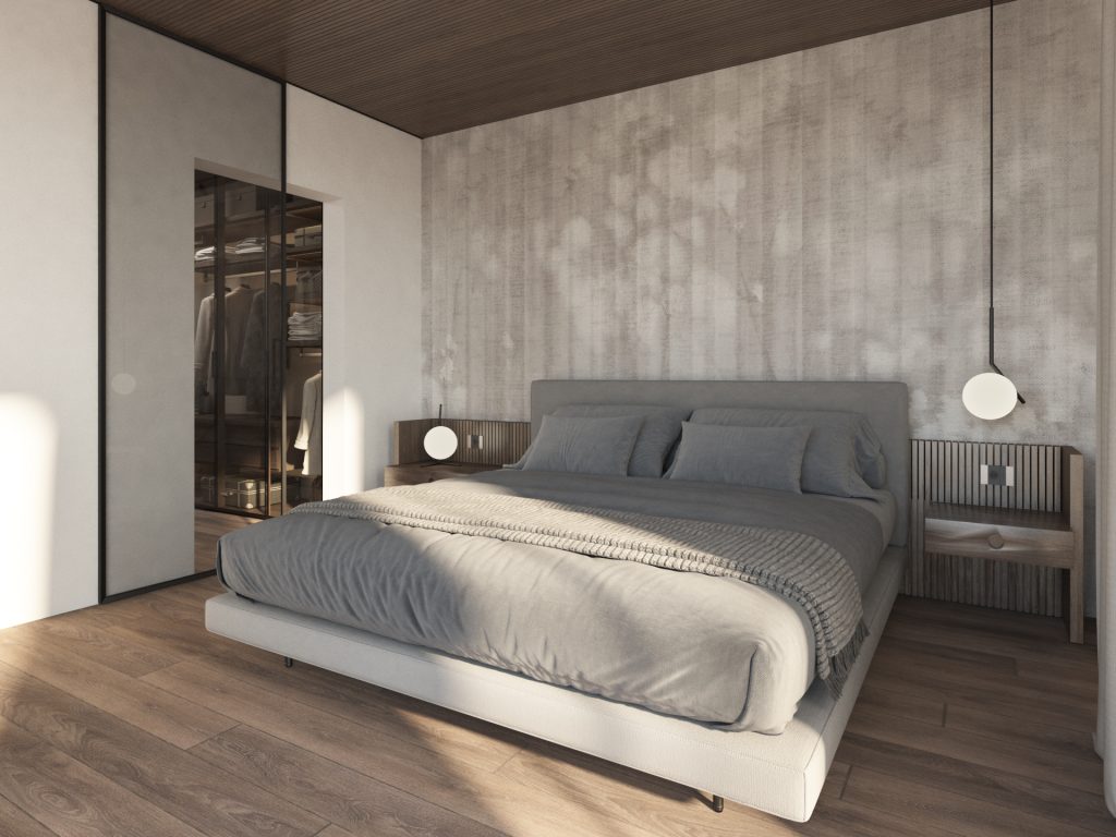 Spalnica je preprosto oblikovana, krasi pa jo tapeta v nevtralnih odtenkih in lesen strop, ki v prostor prinese nekaj dodatne topline.