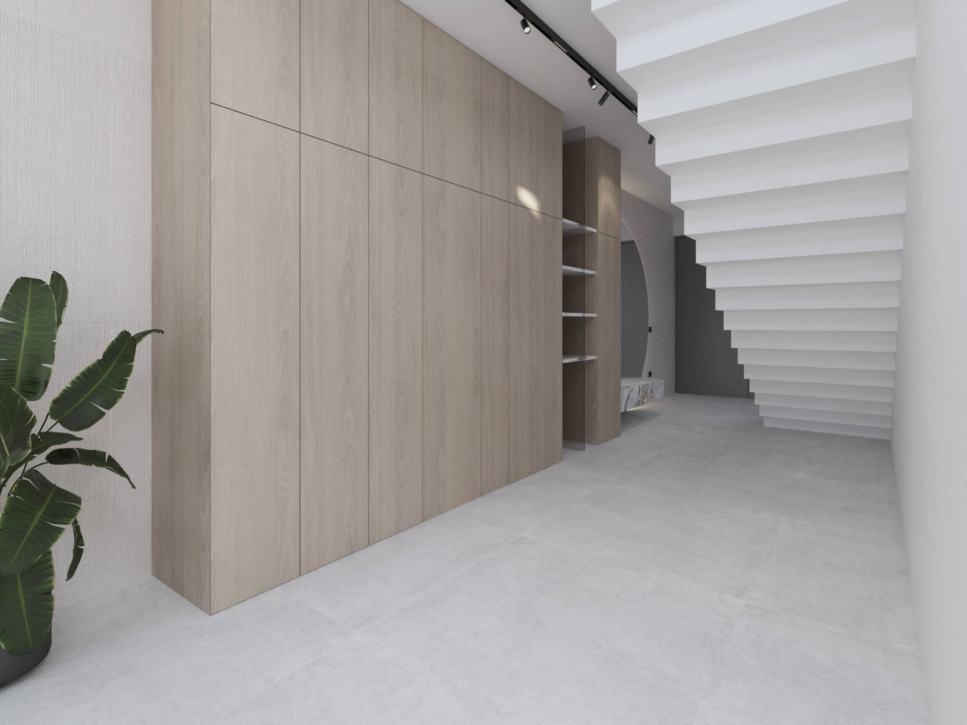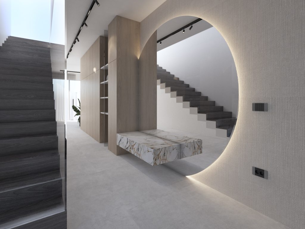 Vhod v hišo predstavlja velik hodnik s stopnicami, ki so glavni arhitekturni element v tem delu. Da bi razbili belino v tem velikem prostoru, smo celotno visoko garderobno omaro naredili leseno, v sklop le te pa smo skrili tudi vrata v tehnične prostore hiše. Na steni je preprosta tapeta v tekstilnem videzu, kamnita klop in veliko okroglo ogledalo pa v prostor vneseta eleganco in podata ton dizajna hiše že ob prvem koraku v le to.