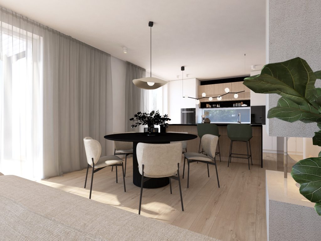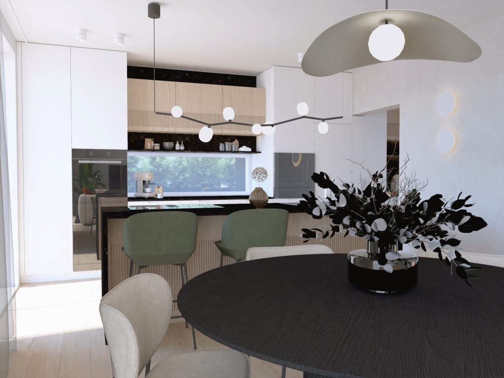 Kuhinjsko-jedilni del je zasnovan maksimalno praktično in uporabno. V središču dnevnega dela stoji okrogla lesena miza v temni barvi kot odgovor na nežne, svetle odtenke, ki jih najdemo na steni, kavču in stolih. Podoben temen poudarek opazimo na kuhinjskem pultu. Mehčajo ga omarice v topli barvi lesa pod in nad njim.