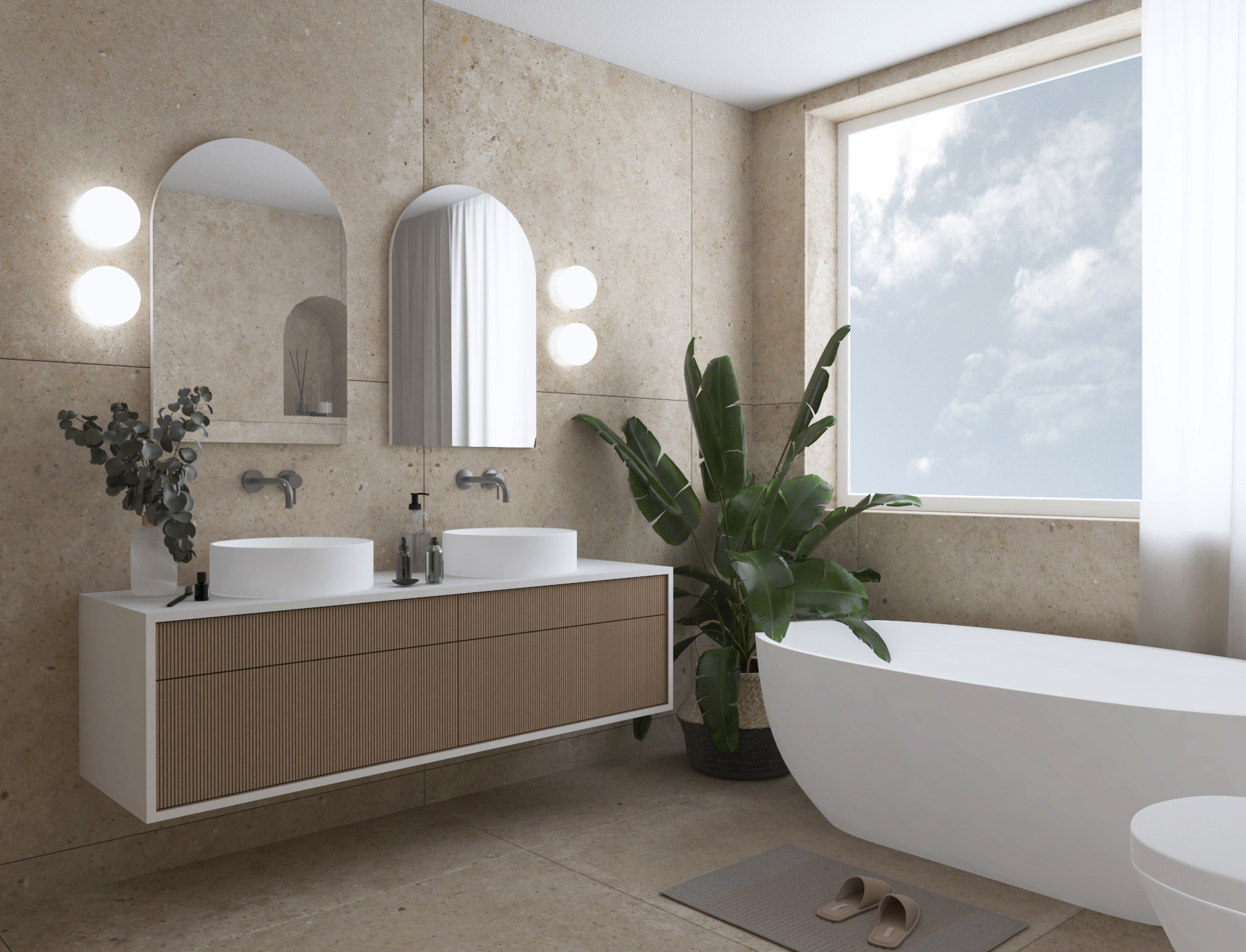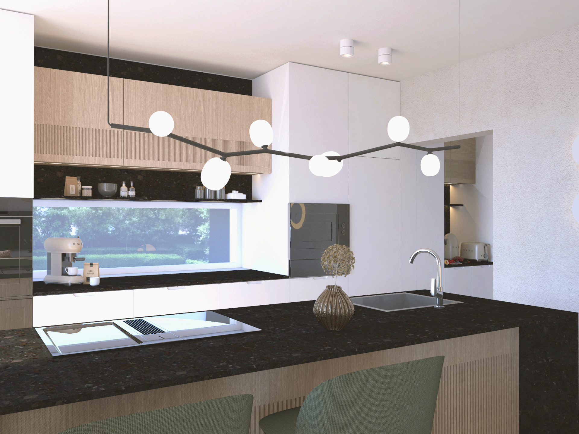 Rdeča nit projekta so svetle barve z naravnimi materiali kot so les, kamen in keramika, za lepši zen ambient pa smo uporabili tudi solne kamne. Veliko je tudi tekstila v nežnih bež in zelenih odtenkih. Zaradi postavitve hiše je v sobah ogromno naravne svetlobe.