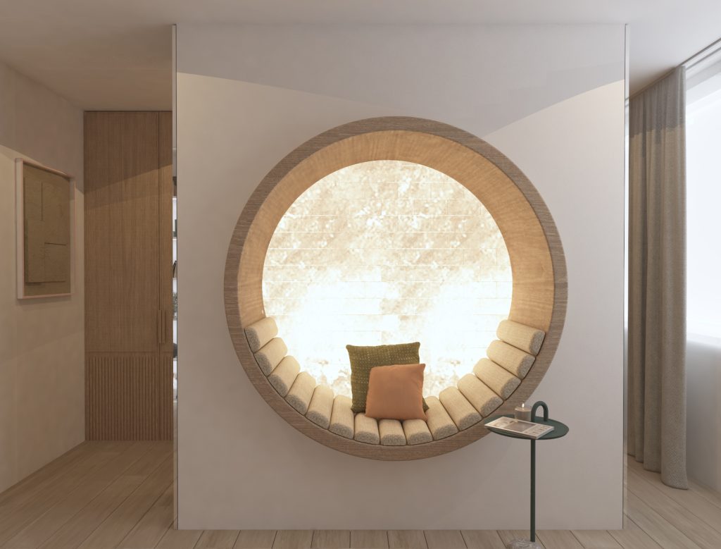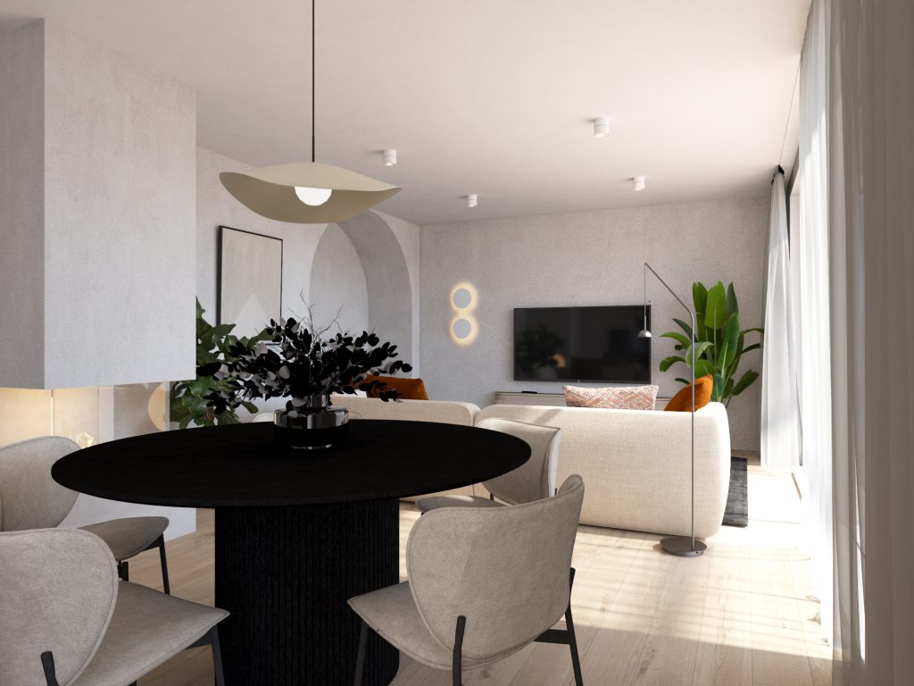 Za mlado družino smo ustvarili topel interier pri katerem smo za izhodišče vzeli mehke oblike. Izrazili smo jih v okrogli mizi, zaobljenimi nišami, v udobni sedežni… Prostor je topel in izčiščen. V treh etažah smo razporedili prostore tako, da ima vsak družinski član svoj personaliziran kotiček in dovolj prostora za sprostitev, delo ali igro.