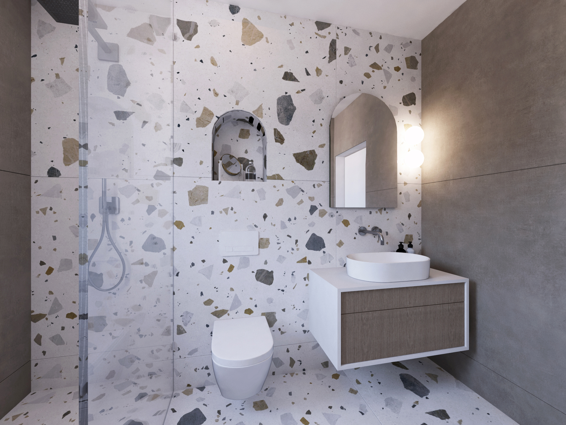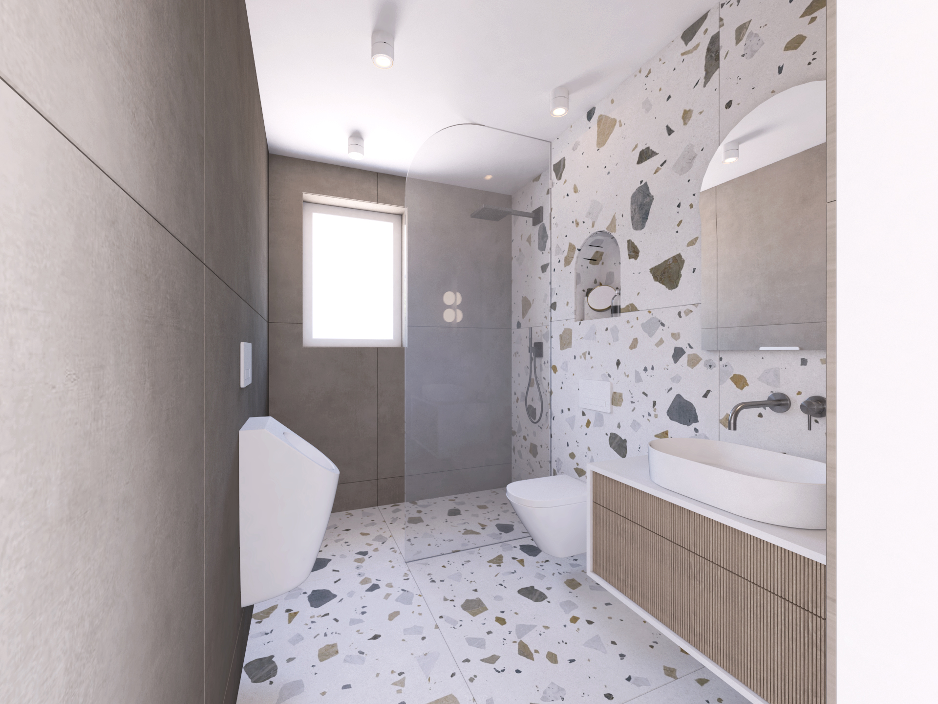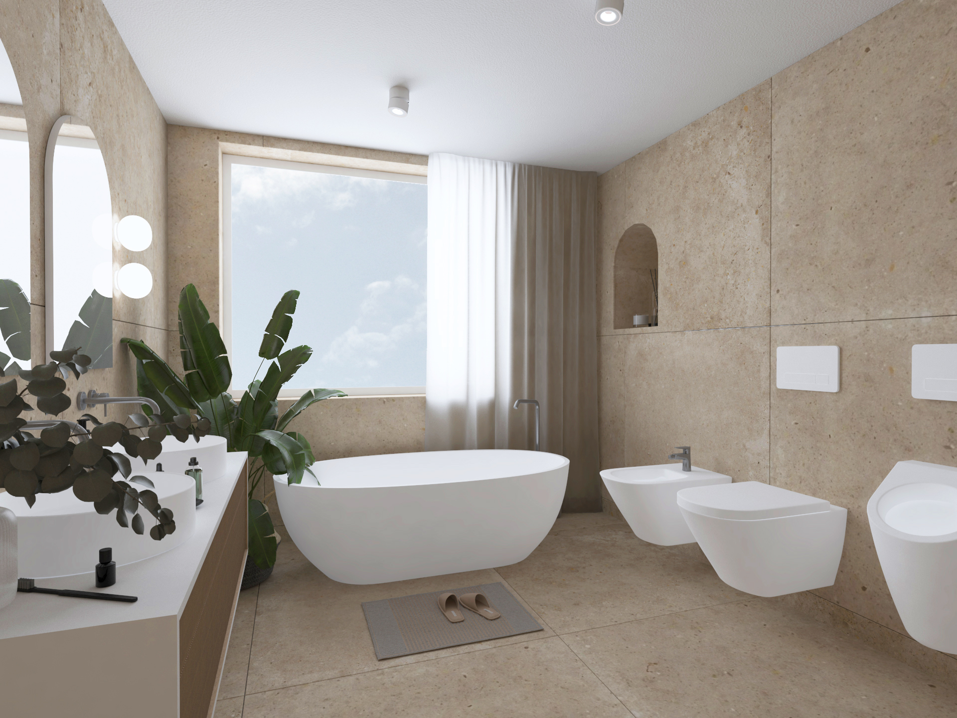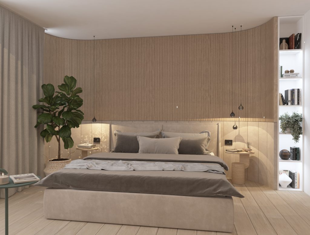 Glavna spalnica je razdeljena na spalni in garderobni del, ki ju deli zen kotiček. Kopalnico smo zaradi stopnišča lahko povečali in tako je postala dovolj velika, da smo vanjo umestili tuš, kad, toalete in omarico z dvema umivalnikoma. V obeh prostorih prevladujejo polkrožne oblike, ki se pojavijo v vzglavju postelje, zen kotičku z osvetljenimi solnimi kamni in pri ogledalih v kopalnici. Prostora s svojimi oblikami in svetlimi barvami vabita k sprostitvi.