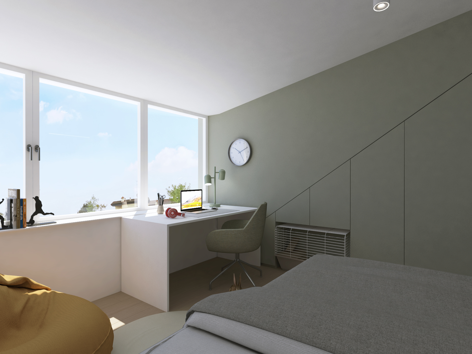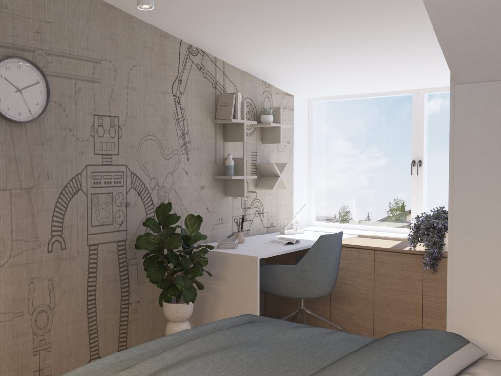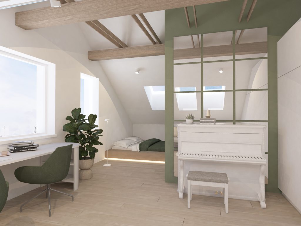 Največja želja naročnice je bila, da je postelja v otroški sobi ločena od preostalega prostora. To smo dosegli tako, da smo jo umestili v skrajni kot sobe, ki je tudi najnižji. Delovna miza, družabni kotiček s pianinom in garderobno omaro pa so mesto dobili v večjem in širšem delu sobe. Prevladujejo žajbljevi odtenki zelene in bela barva. Leseni konstrukcijski tramovi interjerju dodajo toplino