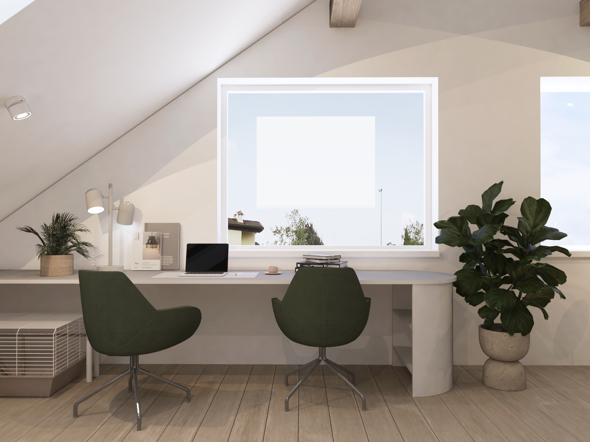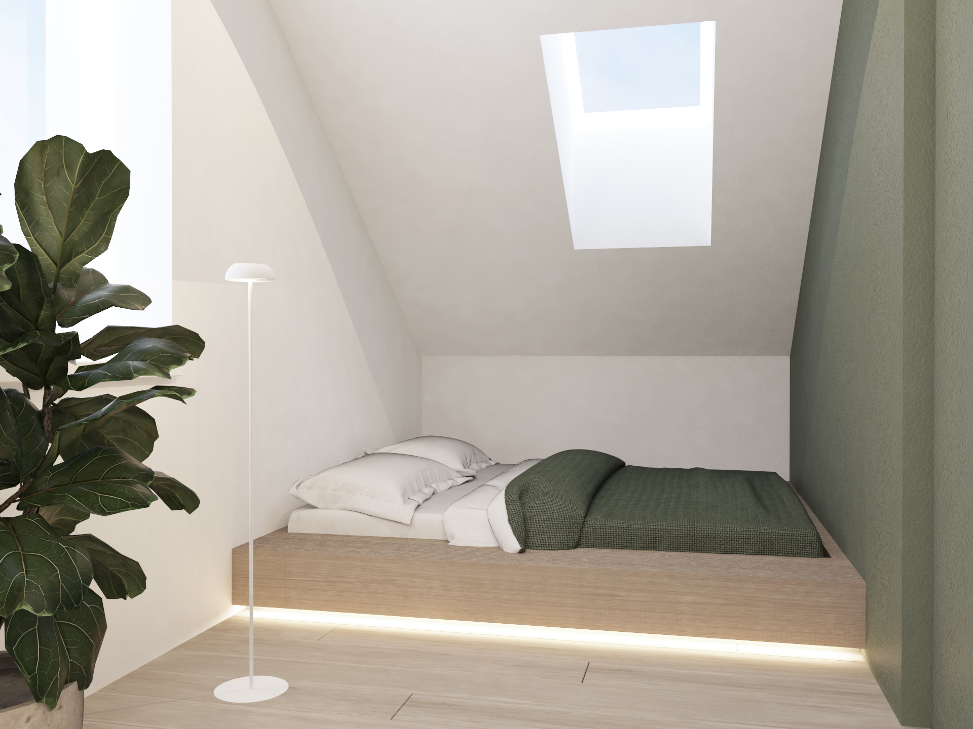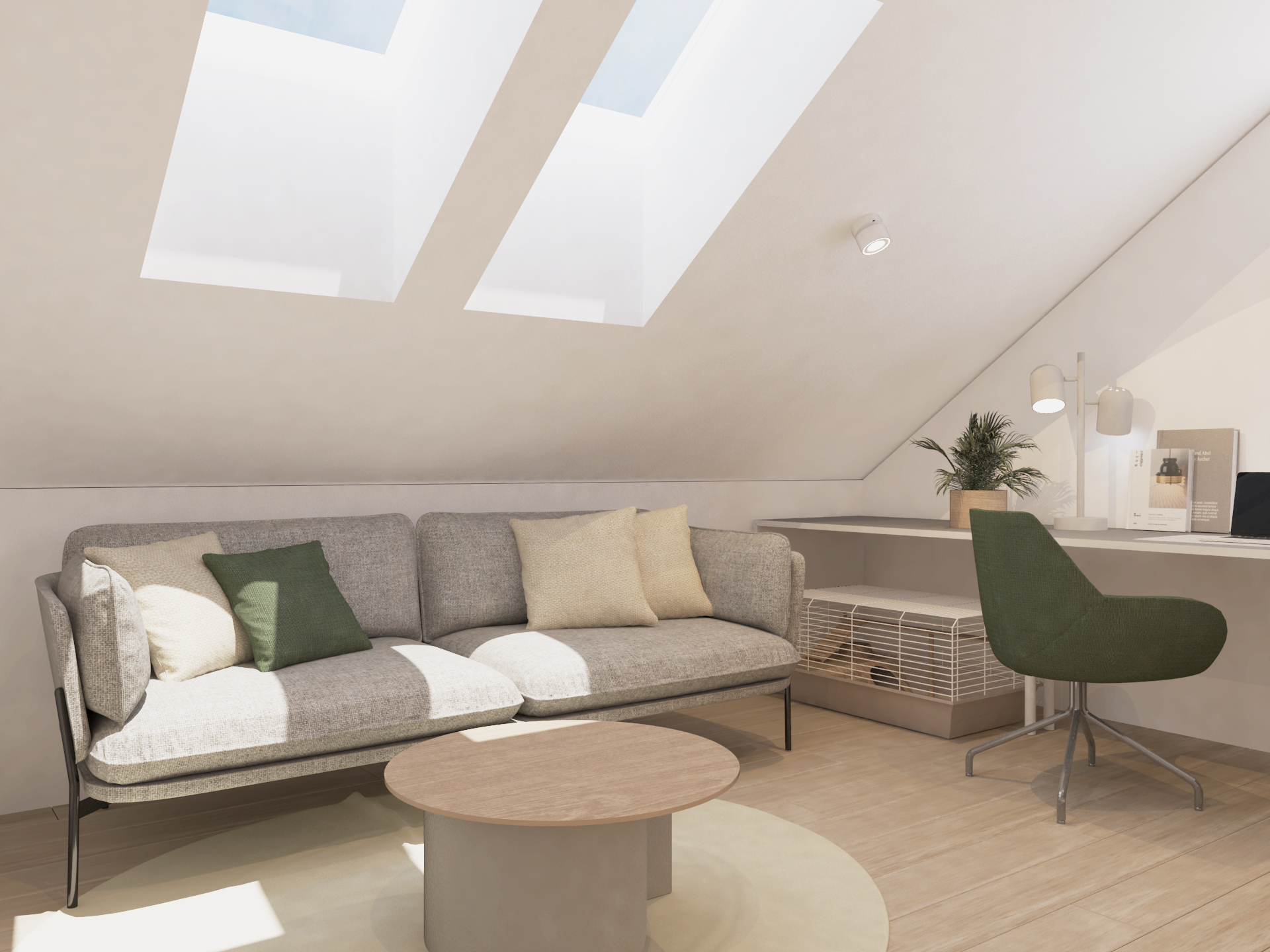 Največja želja naročnice je bila, da je postelja v otroški sobi ločena od preostalega prostora. To smo dosegli tako, da smo jo umestili v skrajni kot sobe, ki je tudi najnižji. Delovna miza, družabni kotiček s pianinom in garderobno omaro pa so mesto dobili v večjem in širšem delu sobe. Prevladujejo žajbljevi odtenki zelene in bela barva. Leseni konstrukcijski tramovi interjerju dodajo toplino